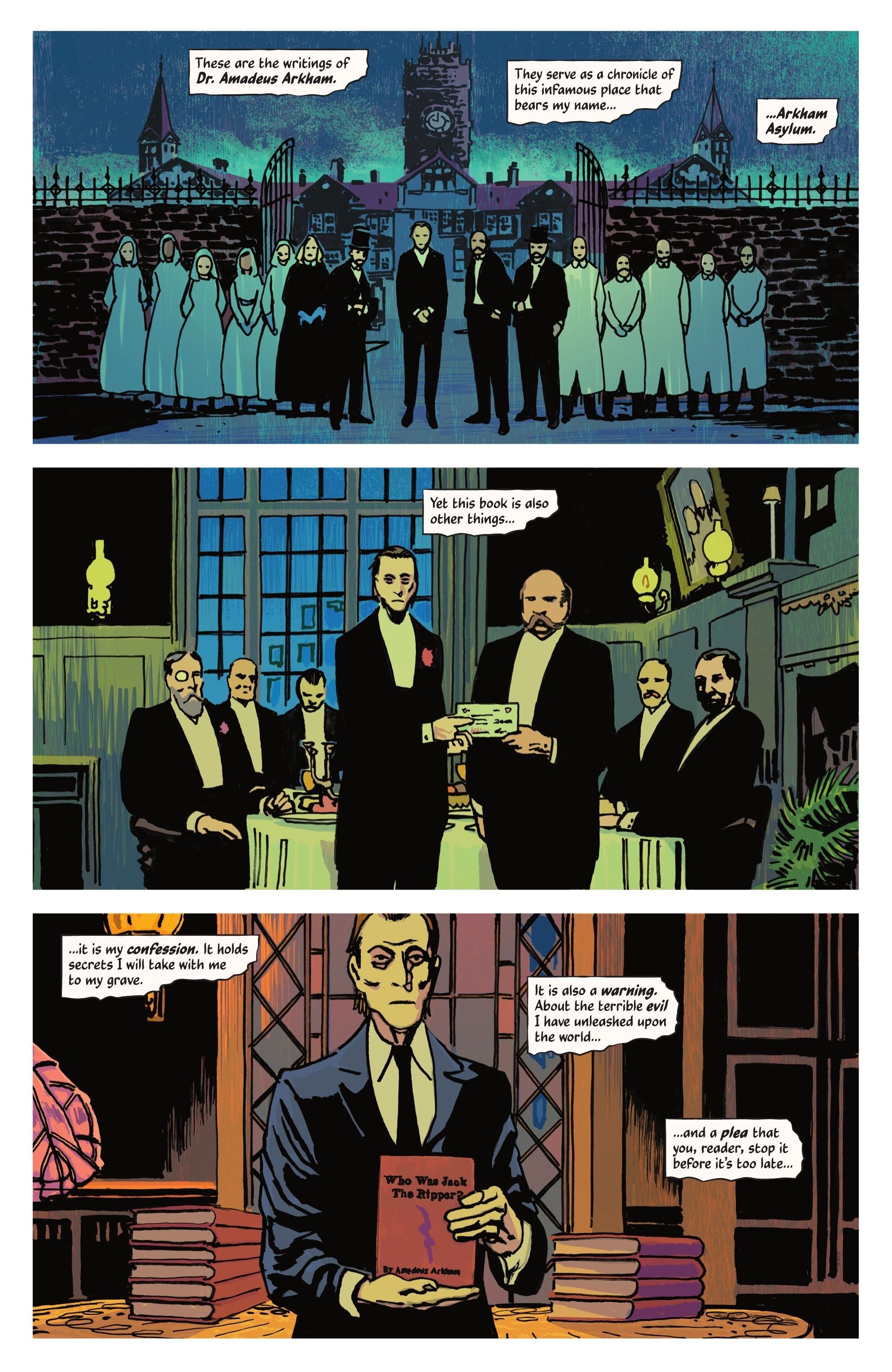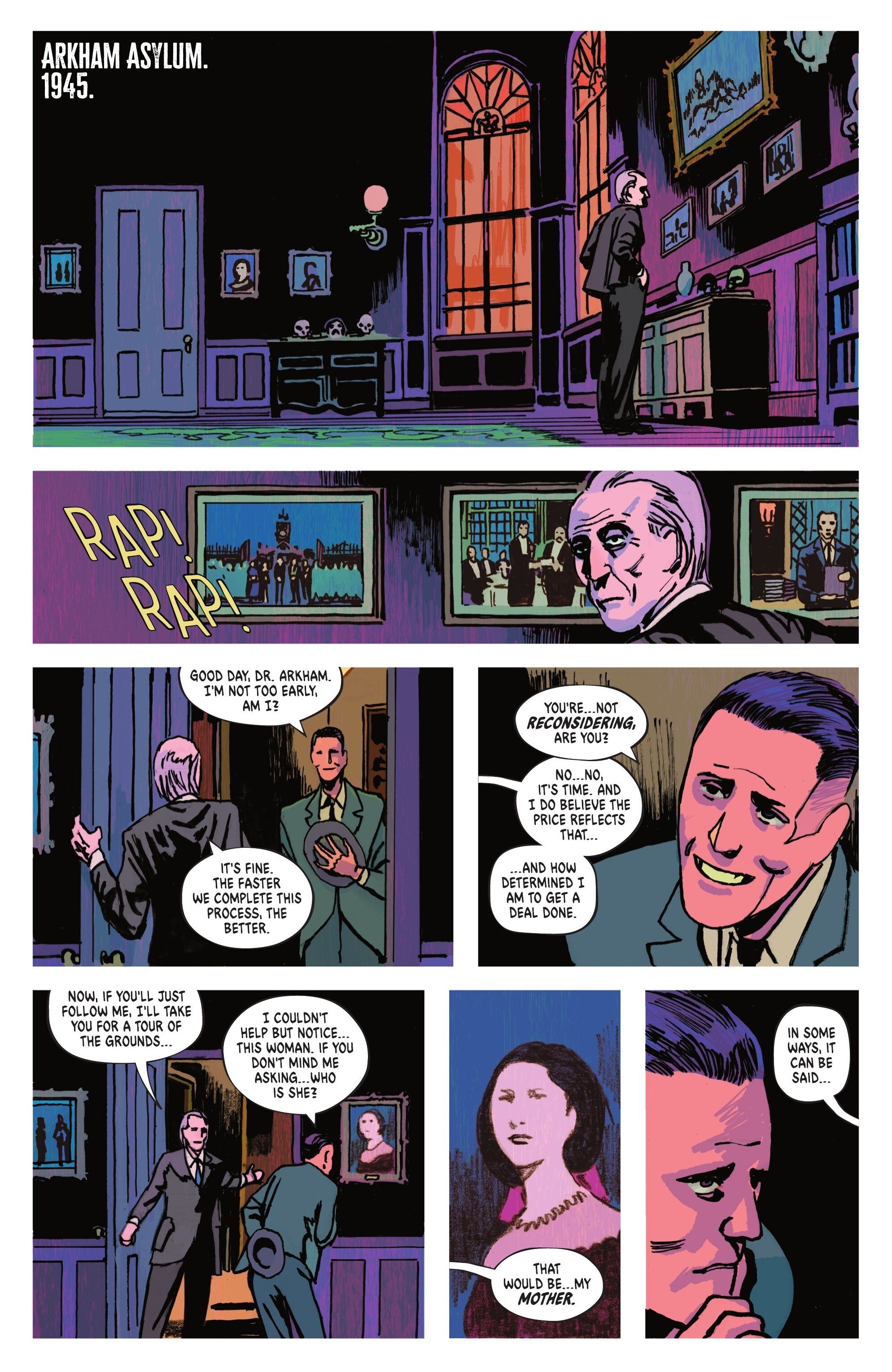 Окей, так большая часть этого комикса происходит далеко в 1945 году. Речь идет о том, как Амадей Аркхэм – человек, который основал Аркхэмский приют – встречает того, кому он его продает. И послушайте это – это Джек Гримм, которого мы все знаем как Джокера! Мы уже знали из других историй, что Джокер существует с 1800-х годов, и этот комикс действительно показывает, как его жизнь была переплетена с Аркхэмским приютом – хотя и не в хорошем смысле. Скорее, речь идет о том, как он был связан с медленным погружением приюта в хаос.