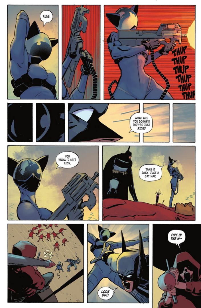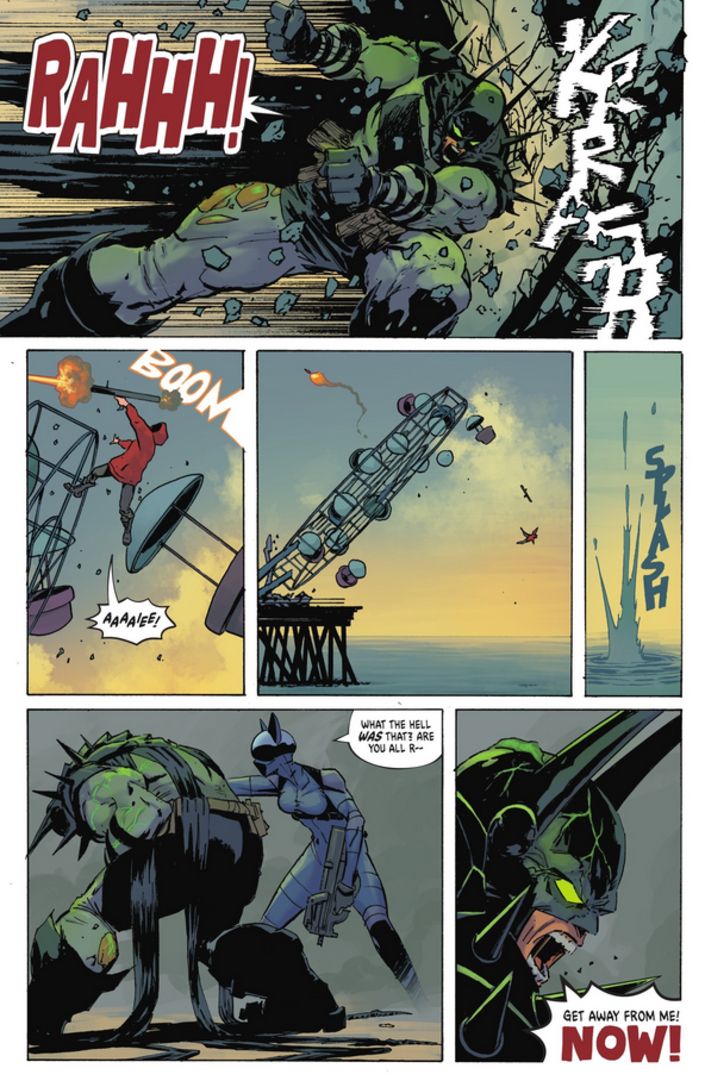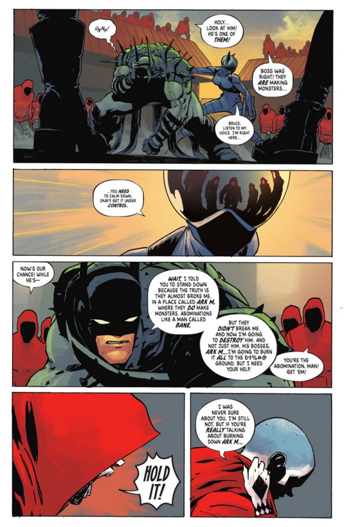 Начать разбиратьсяВ выпуске №13 *Absolute Batman*, Бэтмен объединяется с Женщиной-кошкой и отправляется на территорию банды Красного Колпака. Он быстро оказывается лицом к лицу с большой группой вооруженных врагов, а также с ракетной установкой, нацеленной прямо на него. К счастью, Бэтмену удается нейтрализовать непосредственную угрозу и даже уничтожить башню, на которой она была установлена, но для этого ему приходится использовать наркотик Venom, циркулирующий в его системе. Его растущая зависимость от этого вещества – изначально проклятия Бейна – может поставить под угрозу его отношения с единственным человеком, который его по-настоящему понимает.