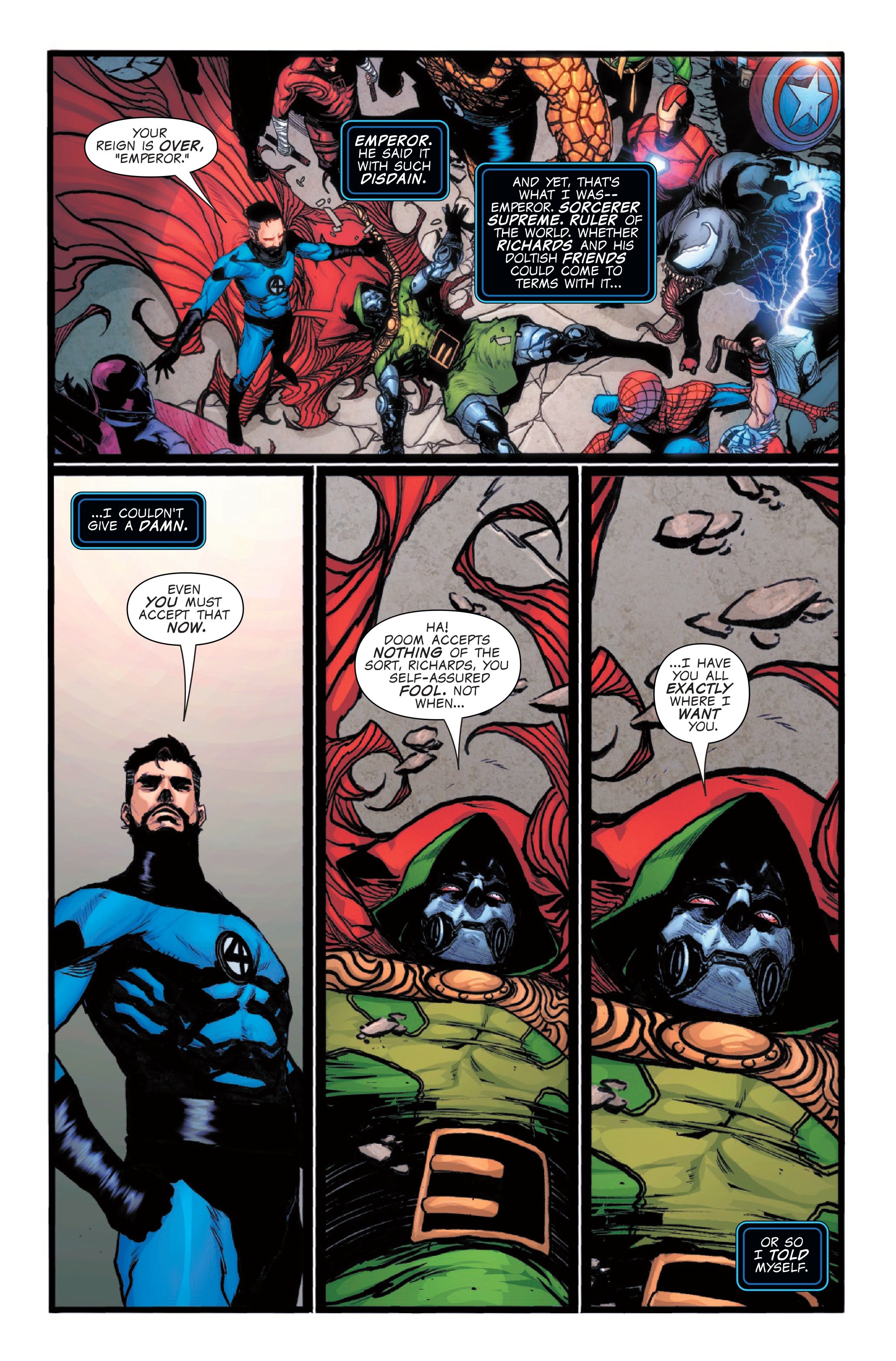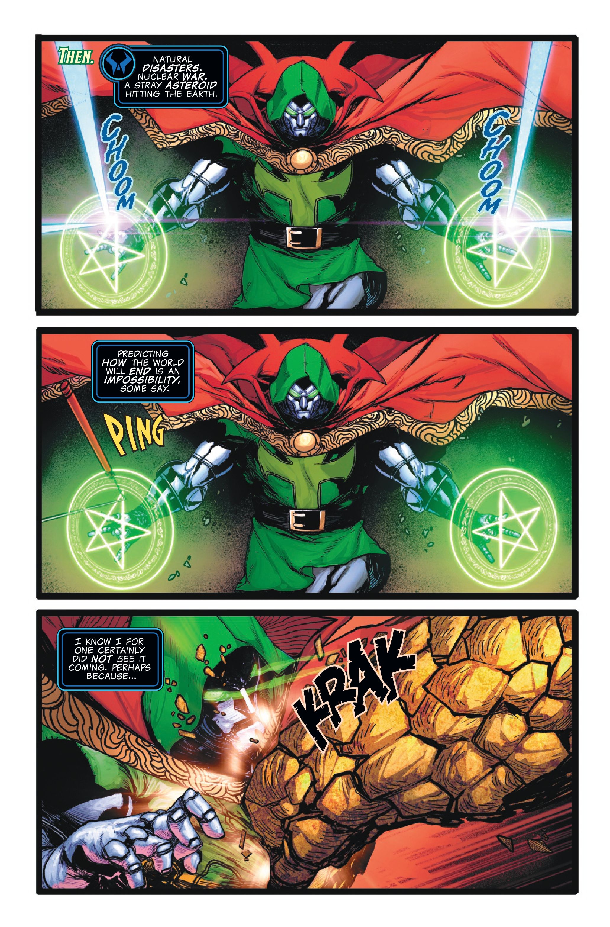 Предварительный просмотр показывает флэшбек к другой версии событий в One World Under Doom. В этой реальности Доктор Дум стал Верховным Чародеем Земли и пытается завоевать планету. Он сражается с героями мира, и кажется, что они побеждают. Работа Фон Рэндала включает в себя потрясающую иллюстрацию на всю страницу, изображающую героев, окружающих, казалось бы, поверженного Дума.