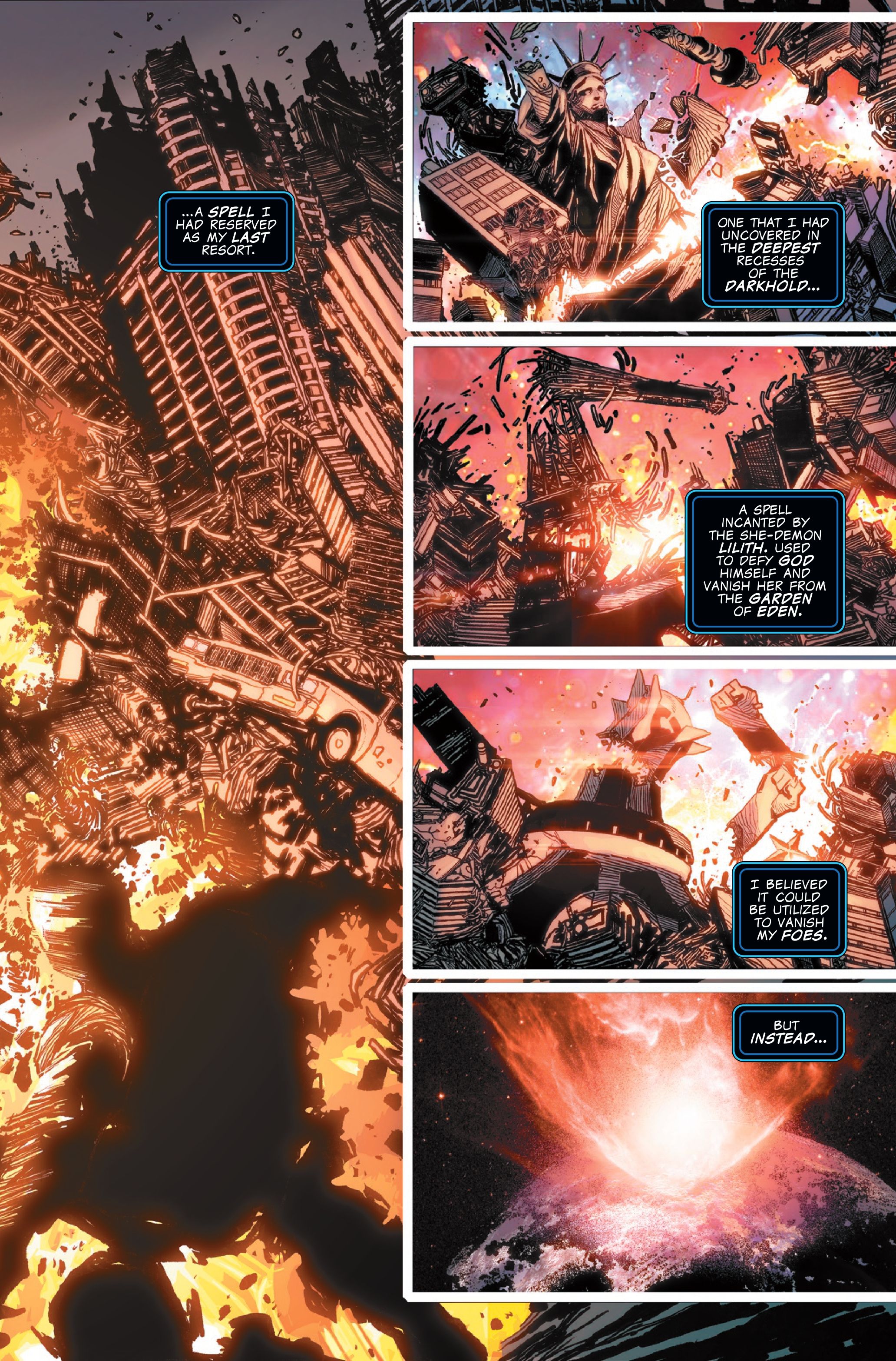 Итак, Doom – это, ну, Doom – всегда заходит слишком далеко. Когда его загнали в угол, когда ему грозило полное поражение, он не просто сдался. Он прибегнул к невероятно рискованному, отчаянному заклинанию, к которому он даже никогда раньше не прибегал. Это сработало – он уничтожил всех своих врагов, но это было слишком мощно. Честно говоря, это была катастрофа – Doom случайно уничтожил всю жизнь на Земле! Это была полная перегиб, даже для него.