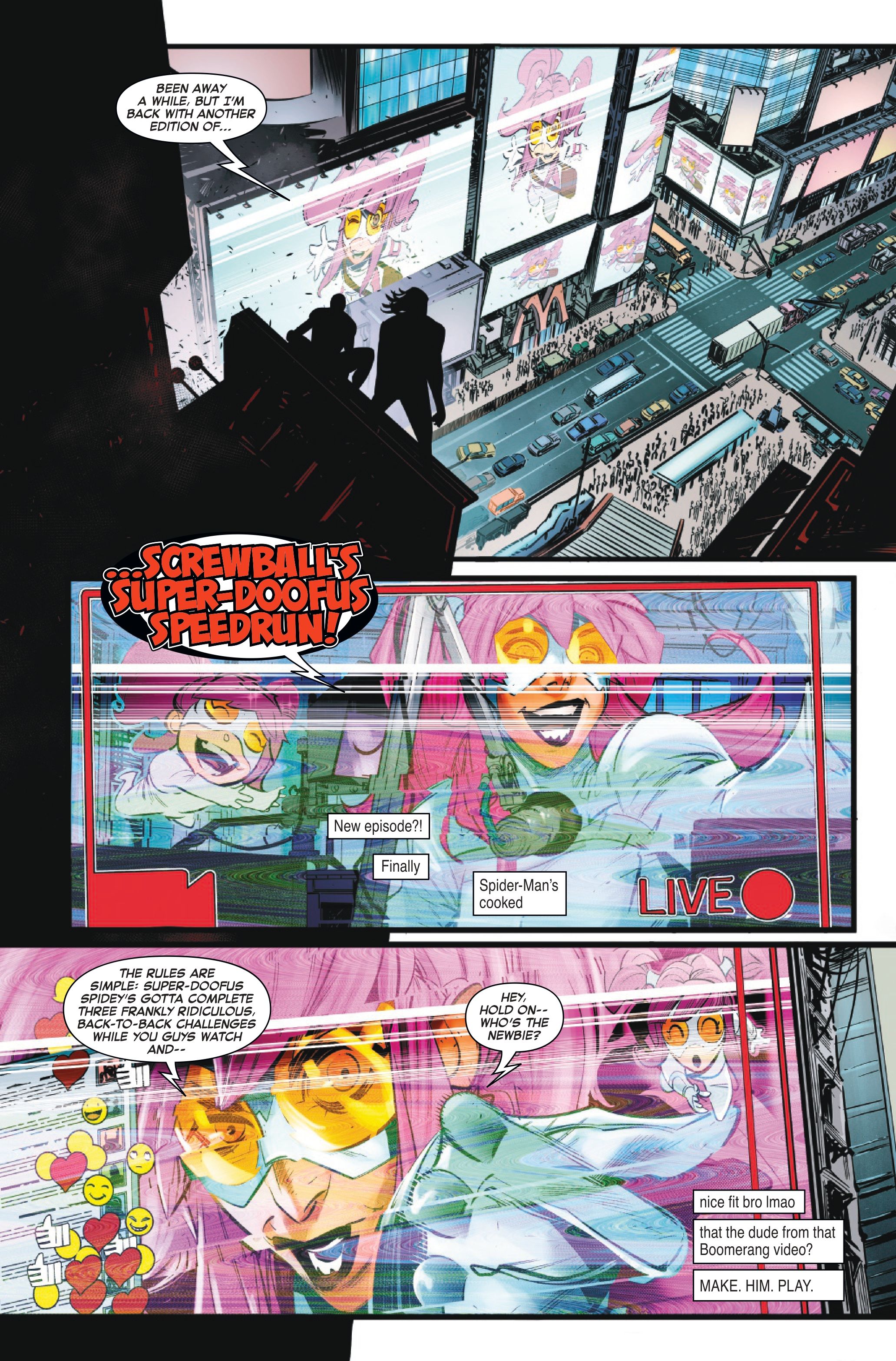 Как только разговор набирает обороты, Screwball врывается в сцену, полная решимости создать опасное видео. Spider-Man и Rapid должны остановить её от того, чтобы подвергать опасности невинных жителей Нью-Йорка серией рискованных испытаний, всё ради получения просмотров и подписчиков для её онлайн-канала.