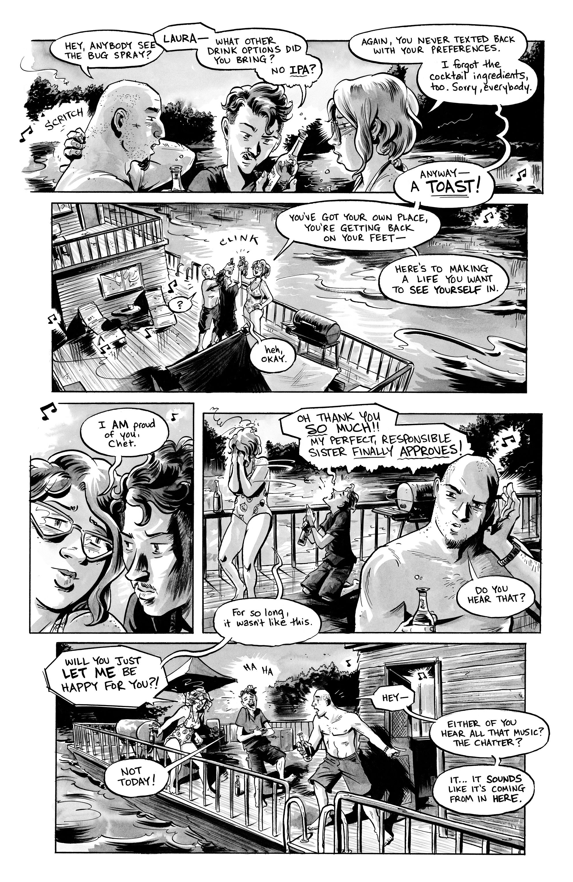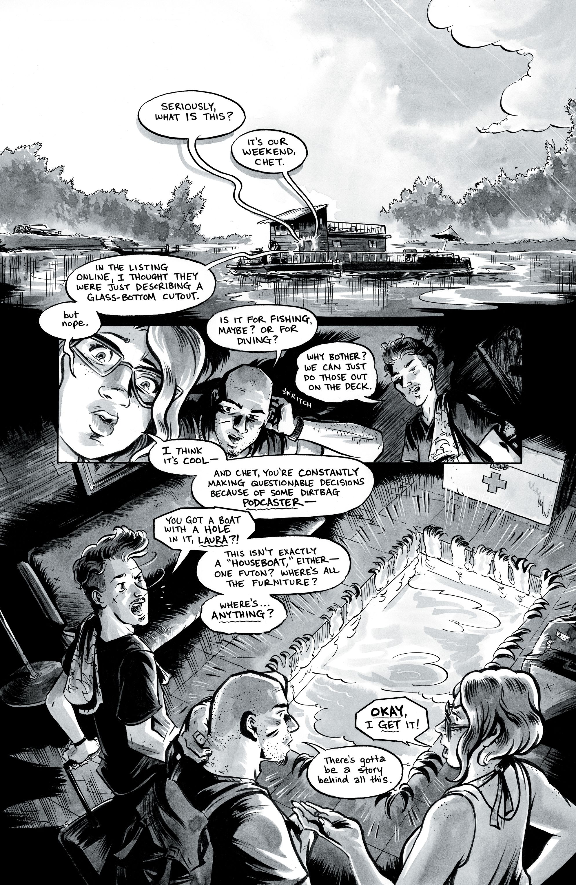 История начинается с прибытия трех человек на арендованный ими для поездки на выходные дом на воде: женатой пары и брата-близнеца жены, Чета.