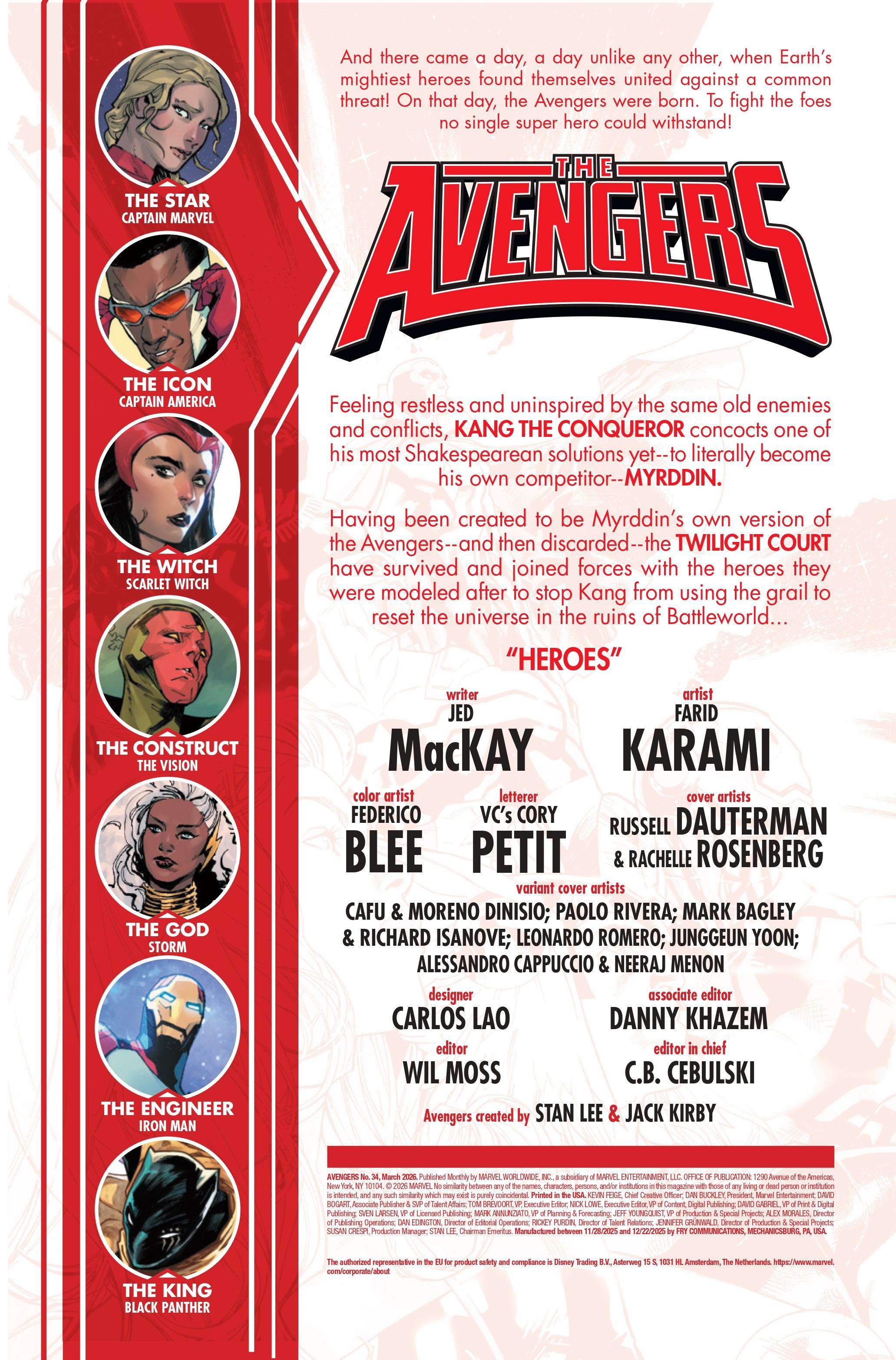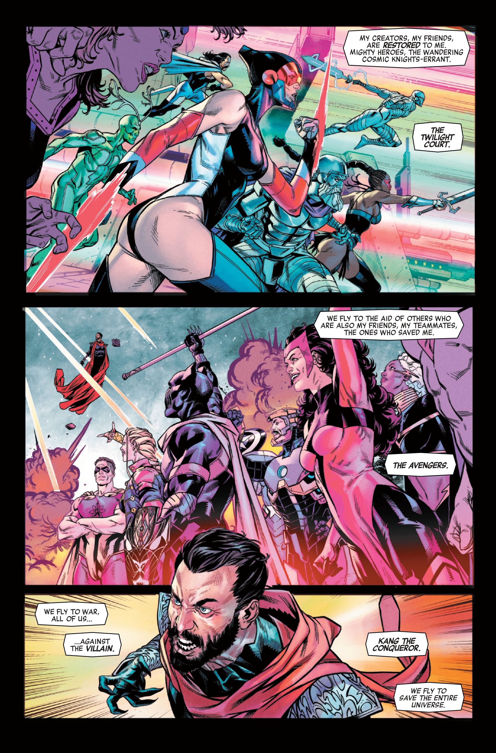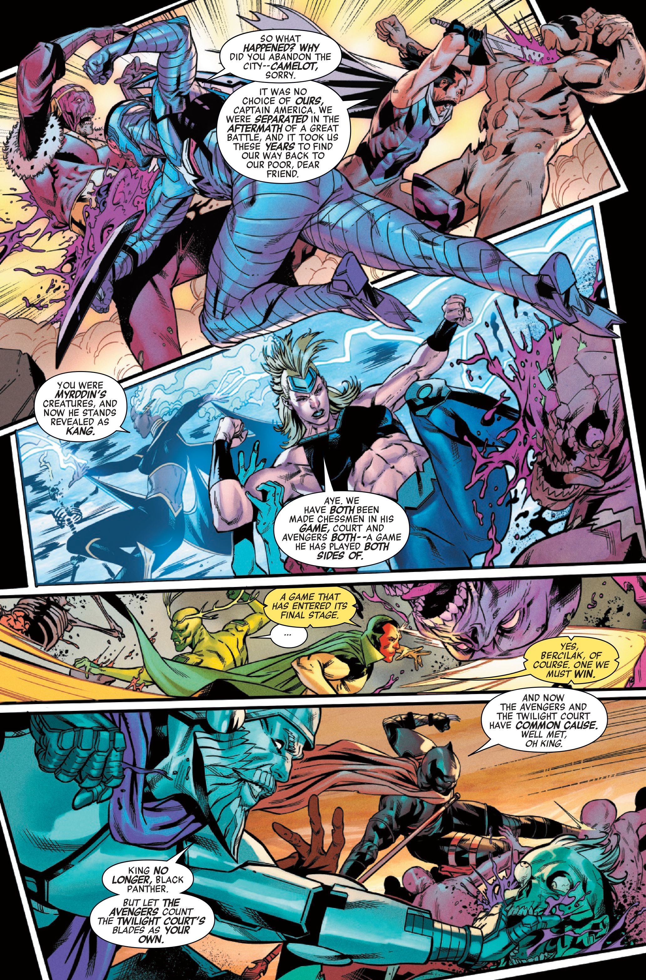 Текущая серия Avengers от Джеда Маккея и Фарида Карама подходит к концу, и история достигает критической точки в Avengers #34. Этот выпуск знаменует собой серьезный сдвиг в конфликте с Кангом. Мстители теперь работают с Сумеречным двором Мирддина, группой, которая не сражалась на их стороне на протяжении веков.