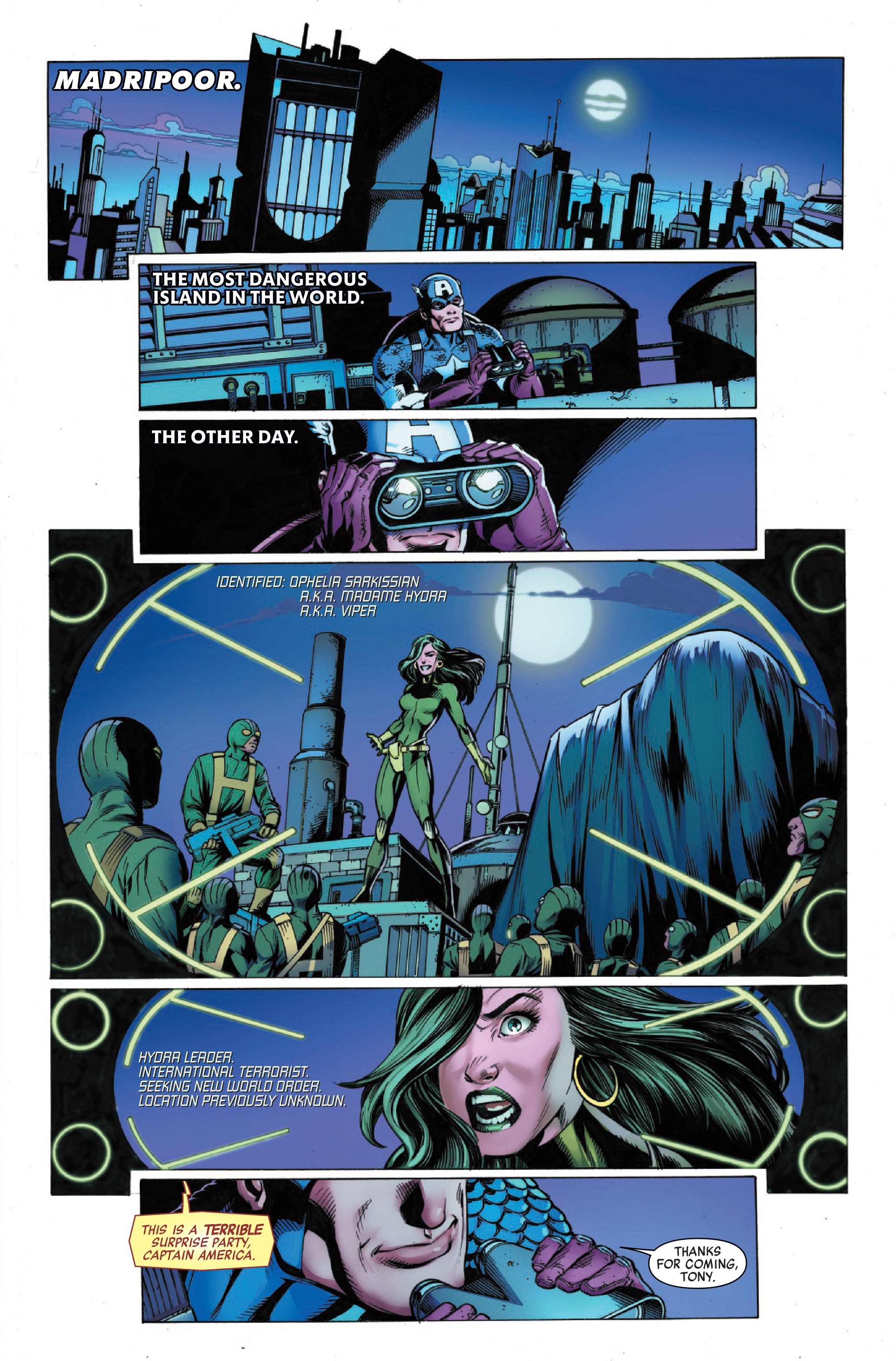 Новая история о Капитане Америке от Бендиса и Бэгли начинается со Стива Роджерса в Мадрипуре, расследующего деятельность, связанную с Мадам Гидрой (также известной как Вайпер). Зная, что Гидра следит за всеми коммуникациями, он использует старую аварийную карточку Мстителей, чтобы запросить помощь – это означает, что отвечать на его просьбу смогут только оригинальные члены Мстителей.