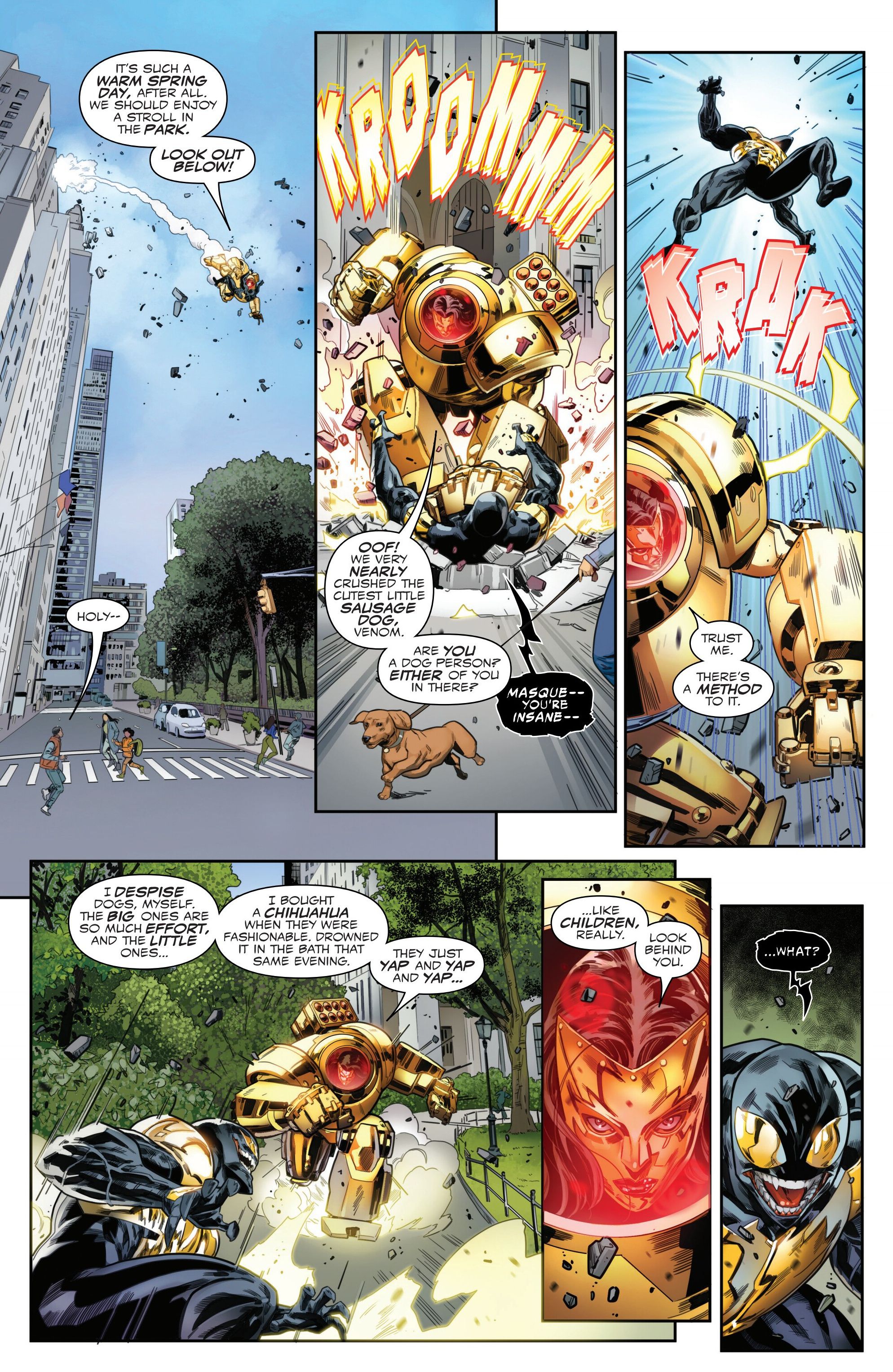 Эта история была не просто захватывающей битвой между Веномом и Мадам Маск – в ней были забавные моменты, когда Маск признала, что битва на самом деле помогла A.I.M. продавать оружие, независимо от того, кто победил. Что более важно, эта сюжетная линия удаляет Мадам Маск и A.I.M. из этой серии, подготавливая их появление в Iron Man вместо этого.