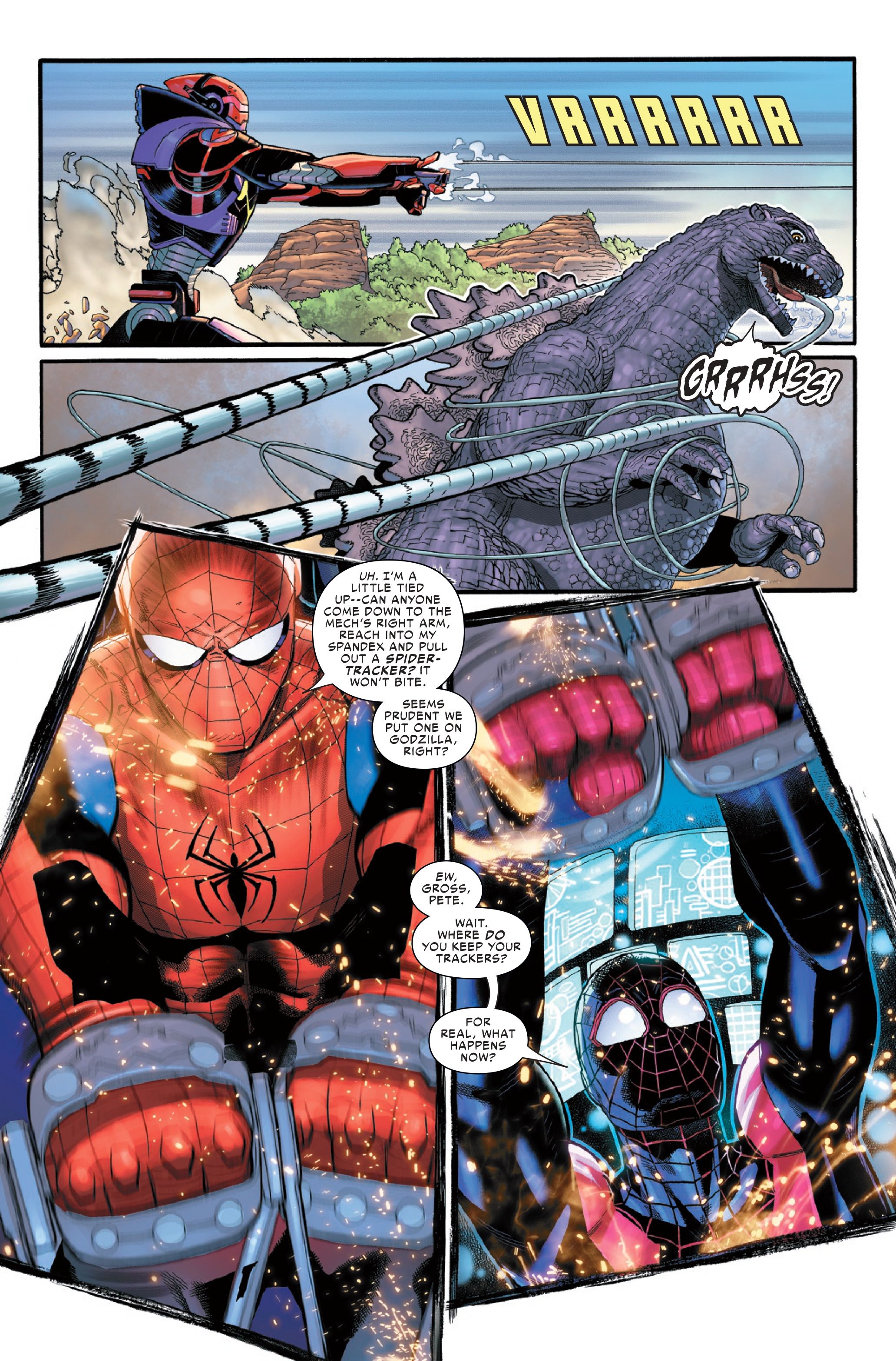 Тогда мы понимаем, что оба Человека-паука управляют паутиной изнутри гигантского робота, и хотя им удалось ненадолго сдержать Годзиллу, это требует от них всех усилий. Они не уверены, как долго смогут его сдерживать. Питер предлагает прикрепить к Годзилле Spider-Tracker, но сомневаюсь, что кто-либо сможет потерять из виду такое огромное существо.