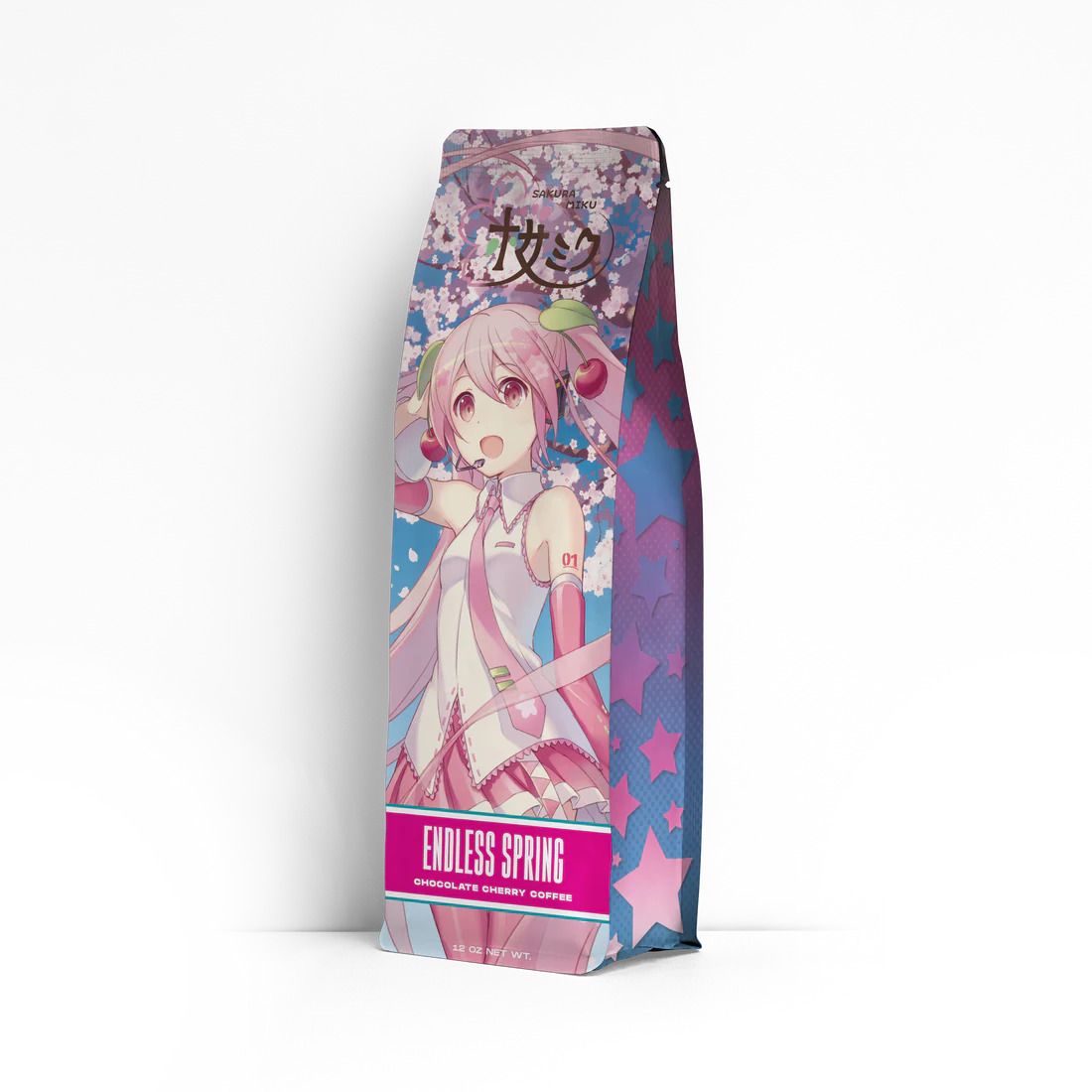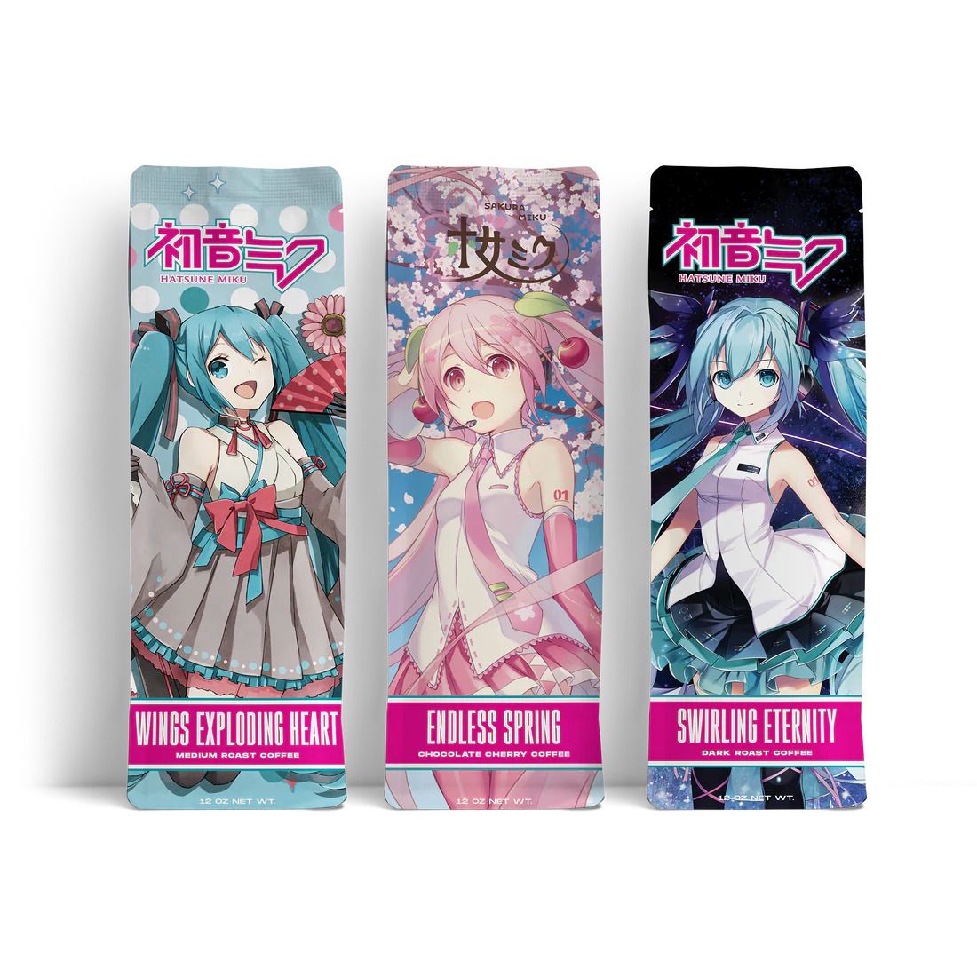 Мы предлагаем три различных сорта обжарки кофе, каждый из которых имеет свой неповторимый вкус. ‘Endless Spring’ имеет вкус вишни и шоколада, ‘Wings Exploding Heart’ – это обжарка средней степени, а ‘Swirling Eternity’ – тёмная обжарка. Кроме того, на каждой упаковке представлена работа другого художника. Однако на обратной стороне каждой упаковки изображён один и тот же милый, упрощённый рисунок Мику и других Vocaloids.