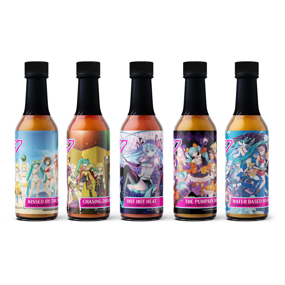 Теперь вы можете заказать 12-унцевые пакеты кофе от Jade City Foods! Они доступны по цене 20 долларов за штуку, или вы можете приобрести упаковку из трех за 50 долларов. Jade City Foods также предлагает пять новых острых соусов с персонажами Vocaloid, такими как Miku, изображенными на этикетках. Каждая бутылка острого соуса стоит 18 долларов, или вы можете купить все пять в наборе за 75 долларов.