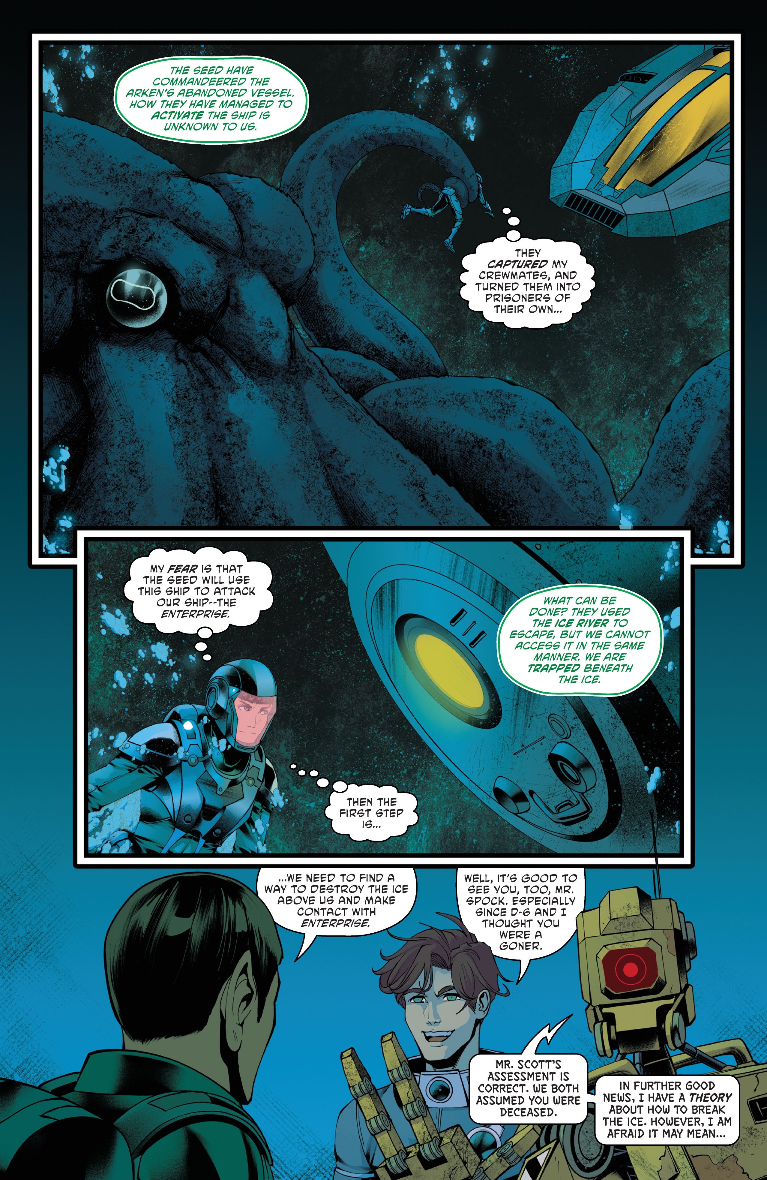 По мере того, как Чапель, Спок, Скотти, Ла’Ан Нуниен-Синг и Номер Один исследовали ледяную планету, они столкнулись со страшными морскими существами, напоминающими Ктулху. Поначалу казалось, что ситуация критическая, но вскоре они обнаружили, что ученые не подвергаются опасности со стороны морских существ. Вместо этого ученые были захвачены растениями, которые сами были заключены в плен на планете.