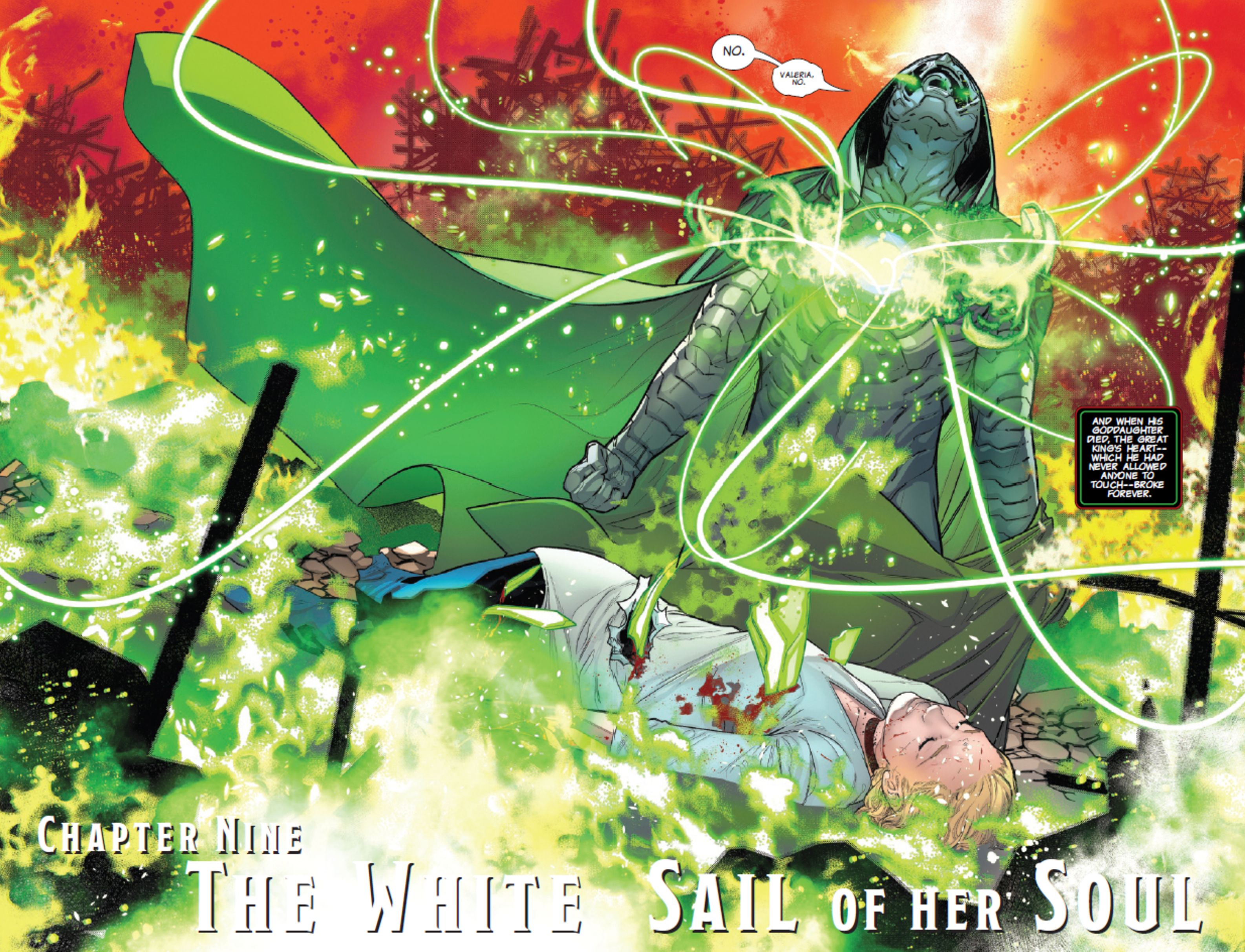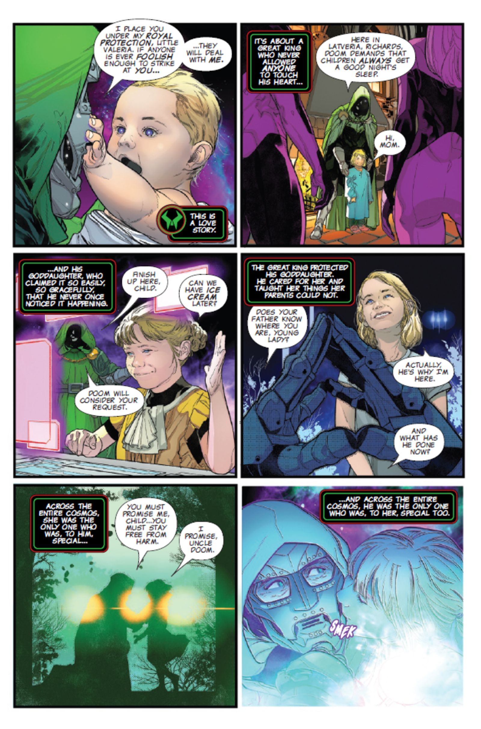 Взгляд на комикс Marvel One World Under Doom #9 (от Райана Норта, Р.Б. Сильвы, Дэвида Куриэля и Трэвиса Ланхэма) раскрывает, как Доктор Дум с теплотой вспоминает особенные моменты со своей крестницей, Валерией Ричардс. Он дорожит всем, начиная с их первой встречи и заканчивая наблюдением за тем, как она превращается в многообещающую и могущественную героиню. Это делает особенно душераздирающим узнать, что Дум невольно стал причиной ее смерти – потери, которую, кажется, он не может преодолеть.