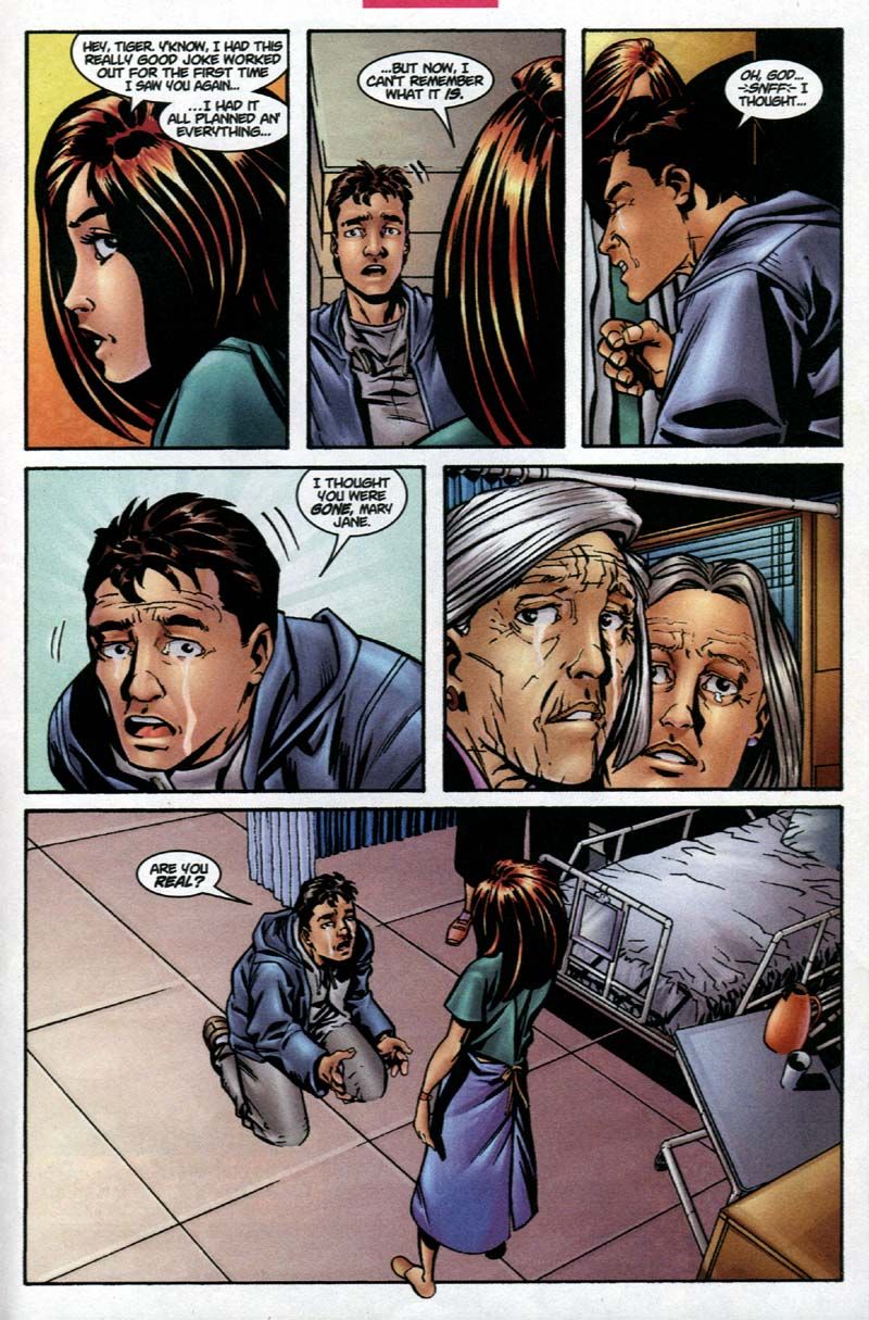 Питер постепенно переживал свою печаль и в конце концов начал исцеляться. Это совпало с тем, что Пол Дженкинс взял на себя управление сериями о Человеке-пауке, пока Макки завершал свою работу над Amazing Spider-Man. После 29 выпусков Amazing Spider-Man и 19 выпусков Peter Parker: Spider-Man, сюжетная линия Макки завершилась кроссоверным событием между двумя сериями. И, как и было обещано, Мэри Джейн вернулась в марте 2001 года!