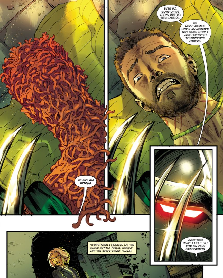 Начать разбиратьсяВ последнем выпуске *Teenage Mutant Ninja Turtles: Shredder* #2 (от Dan Watters, Michele Bandini, Sid Kotian, Marco Lesko и Darran Robinson), Shredder быстро побеждает своего врага, King Cobra, после обнаружения его скрытой базы. Это шокирует, когда обнаруживается, что King Cobra вообще не мутант, а обычный человек с огромным влиянием. Но самое большое удивление – то, что *видит* Shredder – не человека, а ту же извивающуюся массу червей, в которую он был превращен в прошлом.