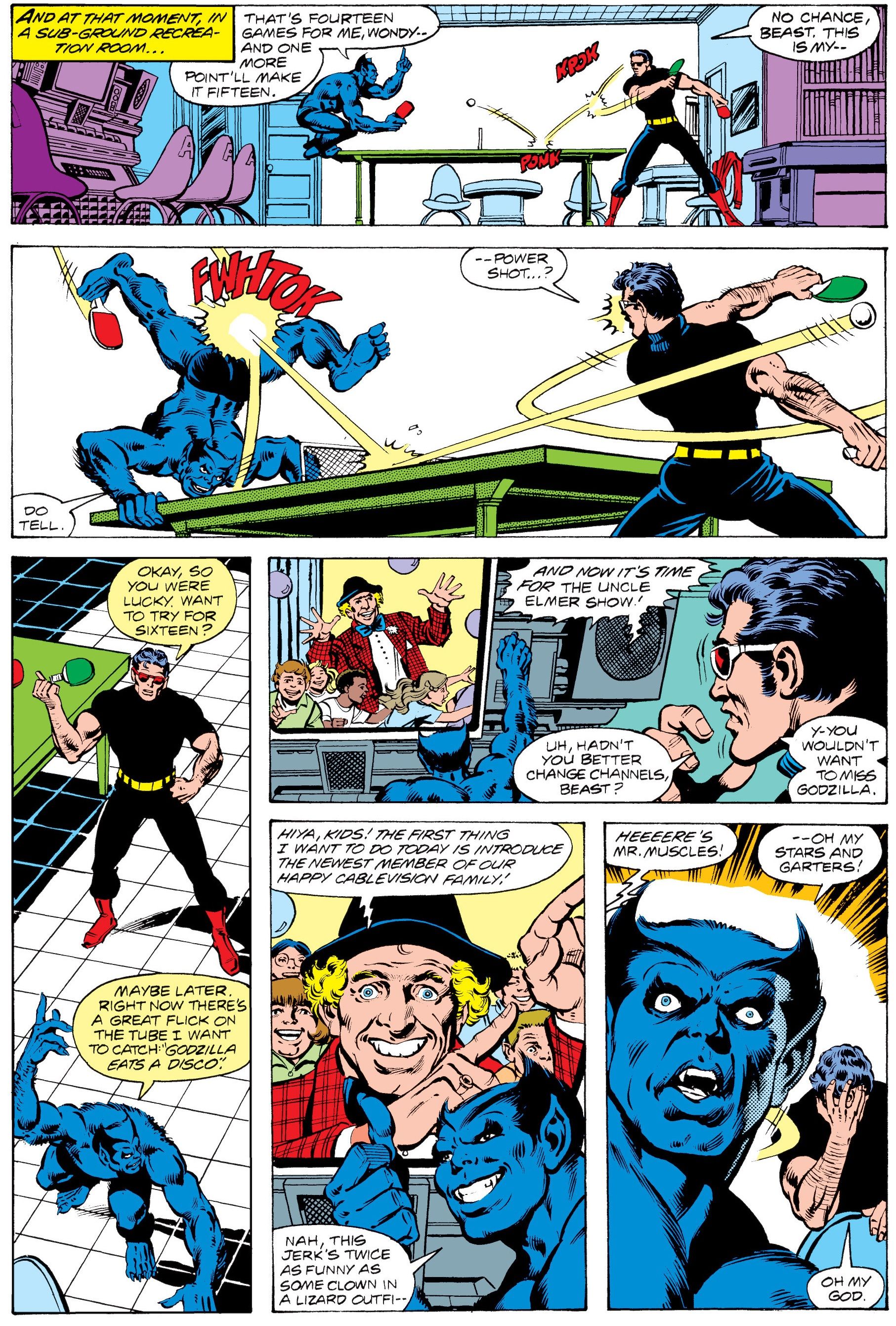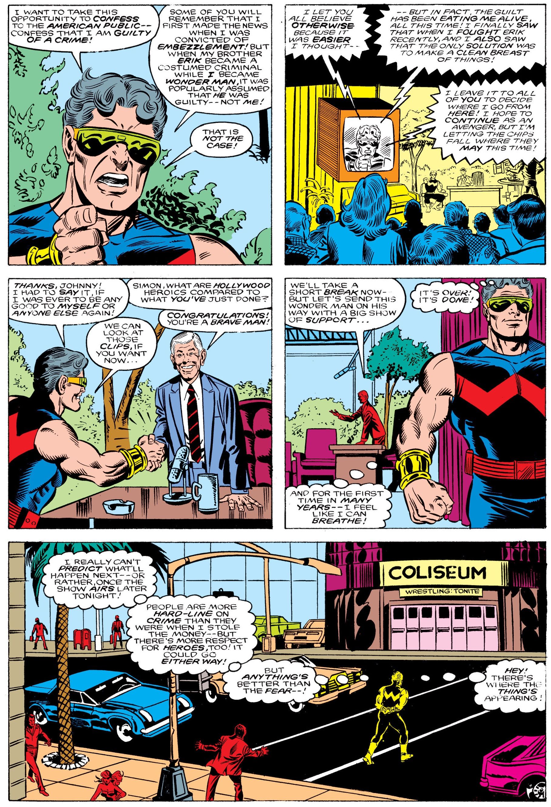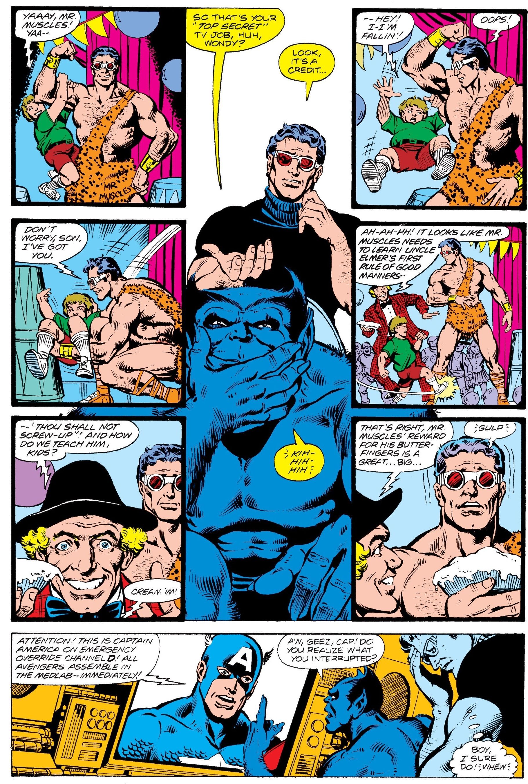 Хотя некоторые Мстители ненадолго покидают команду в этой истории, большинство из них быстро возвращаются, включая Человека-Чудо. Он на самом деле использовал своё свободное время, чтобы заняться актёрской деятельностью, и мы видим его дебют в роли персонажа Мистер Мускул в детской телепередаче, The Uncle Elmer Show.