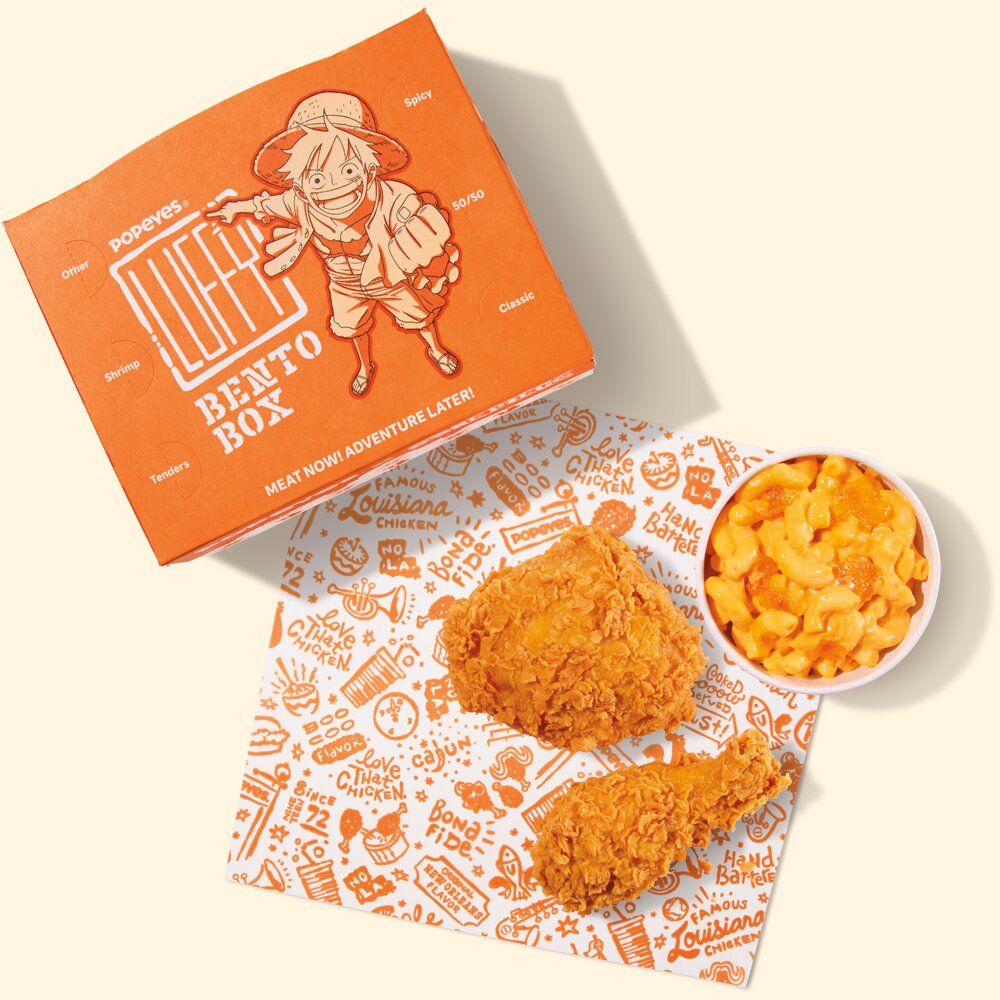 - Ланчбокс с Луффи ($7.99*): Две порции фирменной курицы Popeyes в сочетании с кремовым макаронами с сыром для культового обеда.