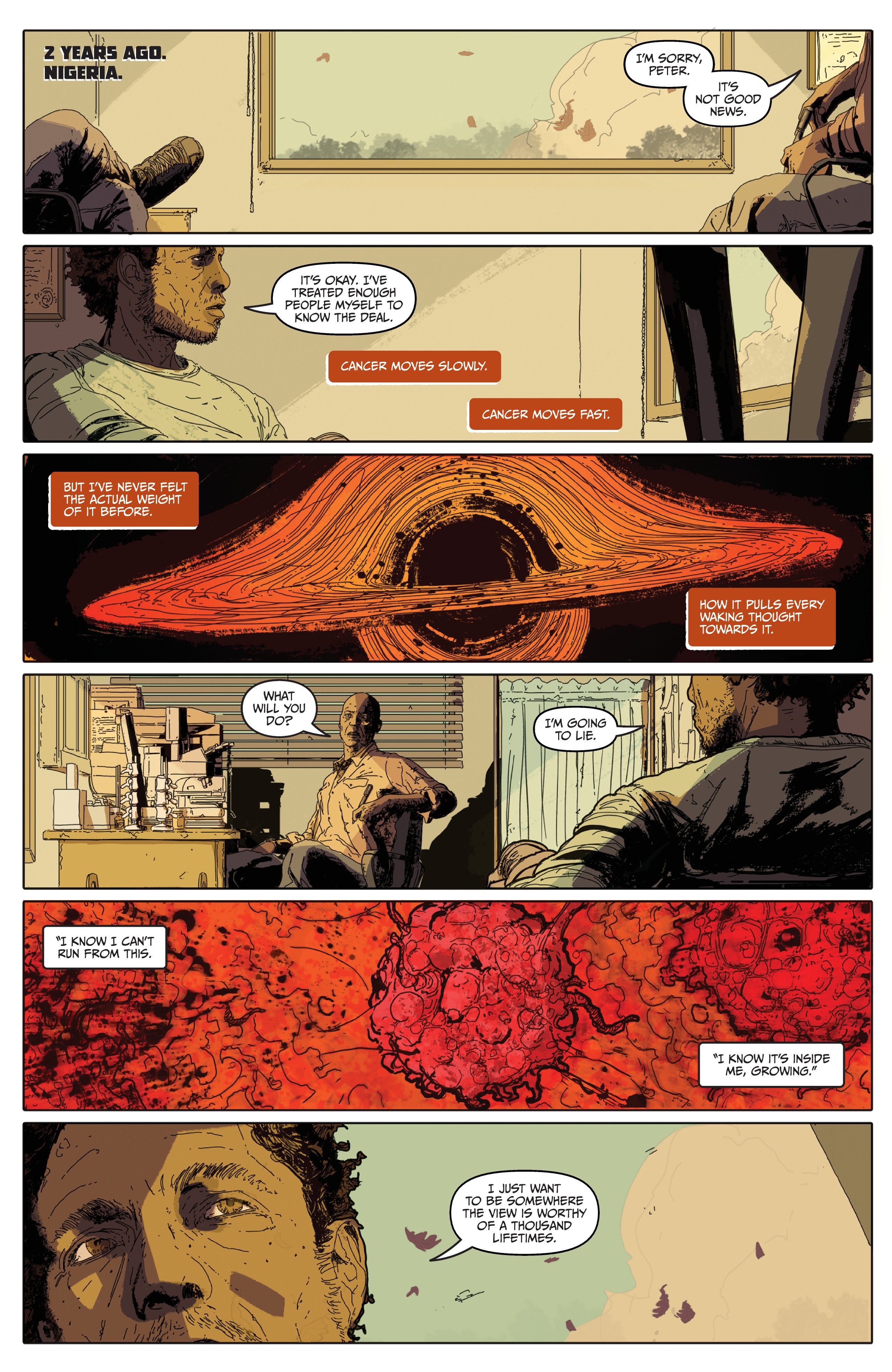Кристиан Уорд развивает концепцию о том, что демон в истории манипулирует людьми, показывая им видения, связанные с их личным опытом. Чтобы эти видения по-настоящему откликались у читателей, нам нужно понимать прошлое экипажа космического корабля. Этот раздел посвящен доктору Питеру Аджеи, который, как мы ранее обнаружили, тайно борется с неизлечимым раком. Он скрывал свою болезнь, чтобы принять участие в миссии.