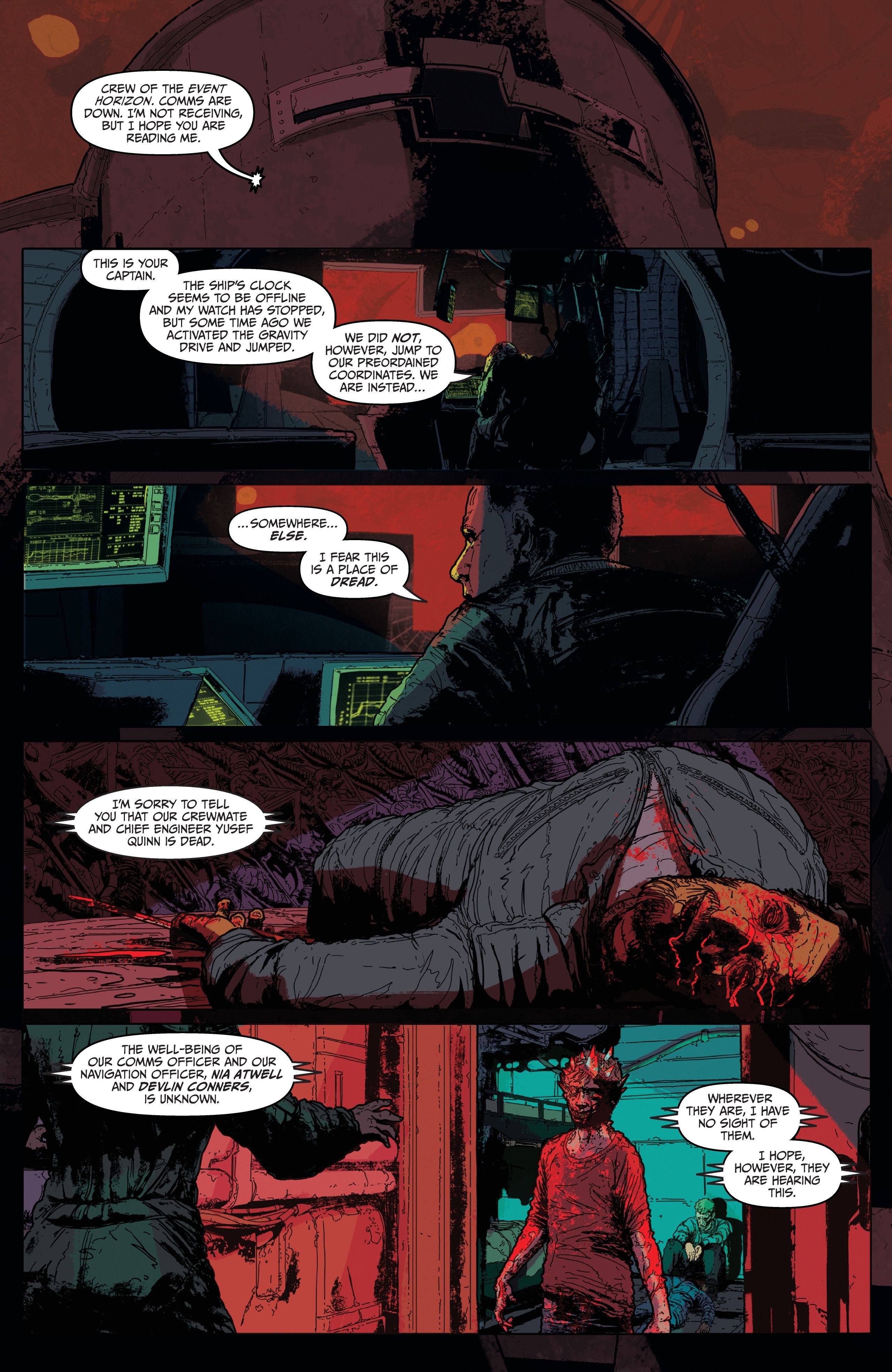 Выпуск №3 Event Horizon: Dark Descent, созданный Christian Ward, Tristan Jones, Pip Martin и Alex Ray, рассказывает о выживших членах экипажа, которые пытаются найти способ одолеть демона, проникшего на их корабль через гравитационный двигатель, проявляющегося в виде ужасающих галлюцинаций.