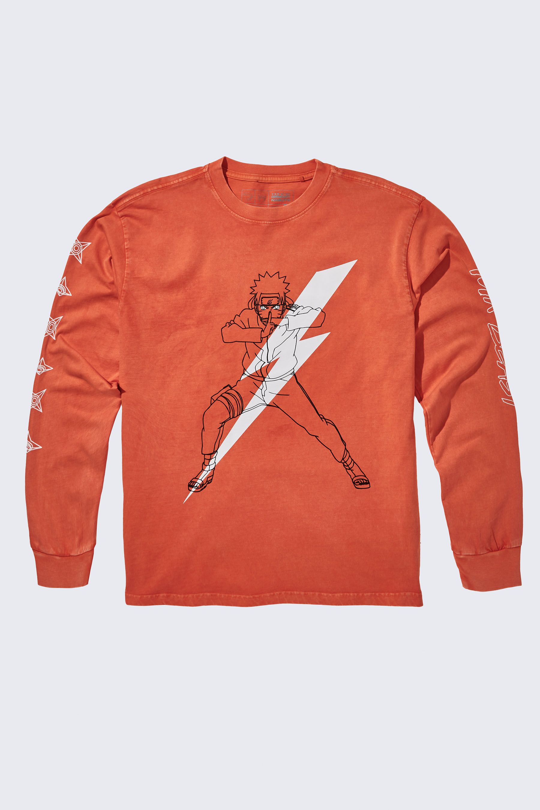 Оранжевая футболка с длинными рукавами Senko изображает черно-белое изображение Наруто, использующего технику «Теневой клон», на фоне белой молнии. Белые графические элементы на рукаве включают логотип MrBeast в стиле шрифта Naruto Shippuden, а также линию сюрикенов. Белая футболка Uzumaki демонстрирует полноцветное изображение Наруто поверх оранжевой молнии, а на левом рукаве изображено имя Наруто на японских иероглифах поверх логотипа MrBeast.