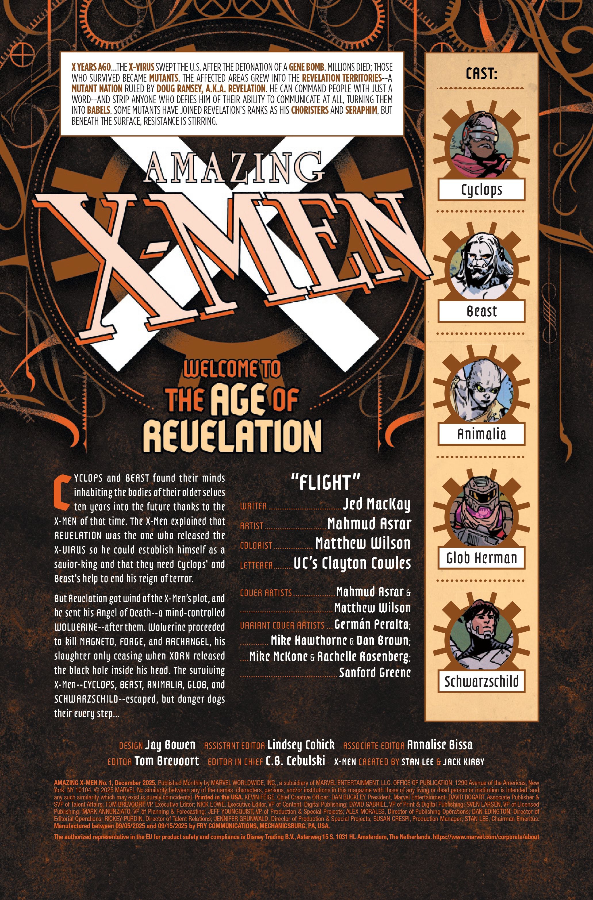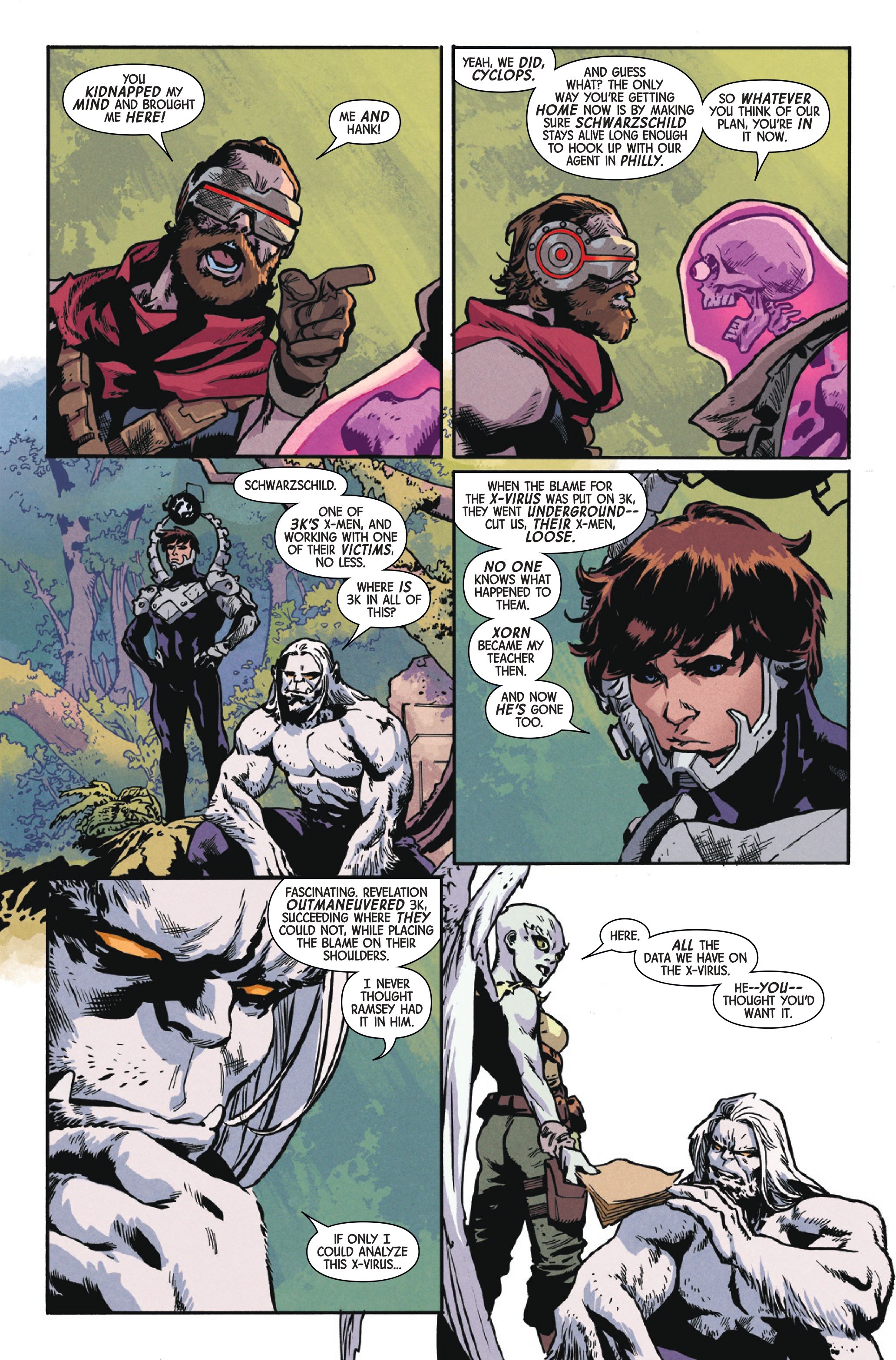 На превью-страницах мы видим Циклопа и Зверя, столкнувшихся с неожиданным перемещением на десять лет в трудное будущее. Они быстро понимают, что кто-то, кто раньше был одним из их врагов — член 3K’s X-Men — теперь помогает им. Они обнаруживают, что 3K покинул свою команду ‘X-Men’ после того, как Revelation успешно обвинил 3K в высвобождении X-Вируса. Затем Зверь пытается узнать больше подробностей о X-Вирусе.