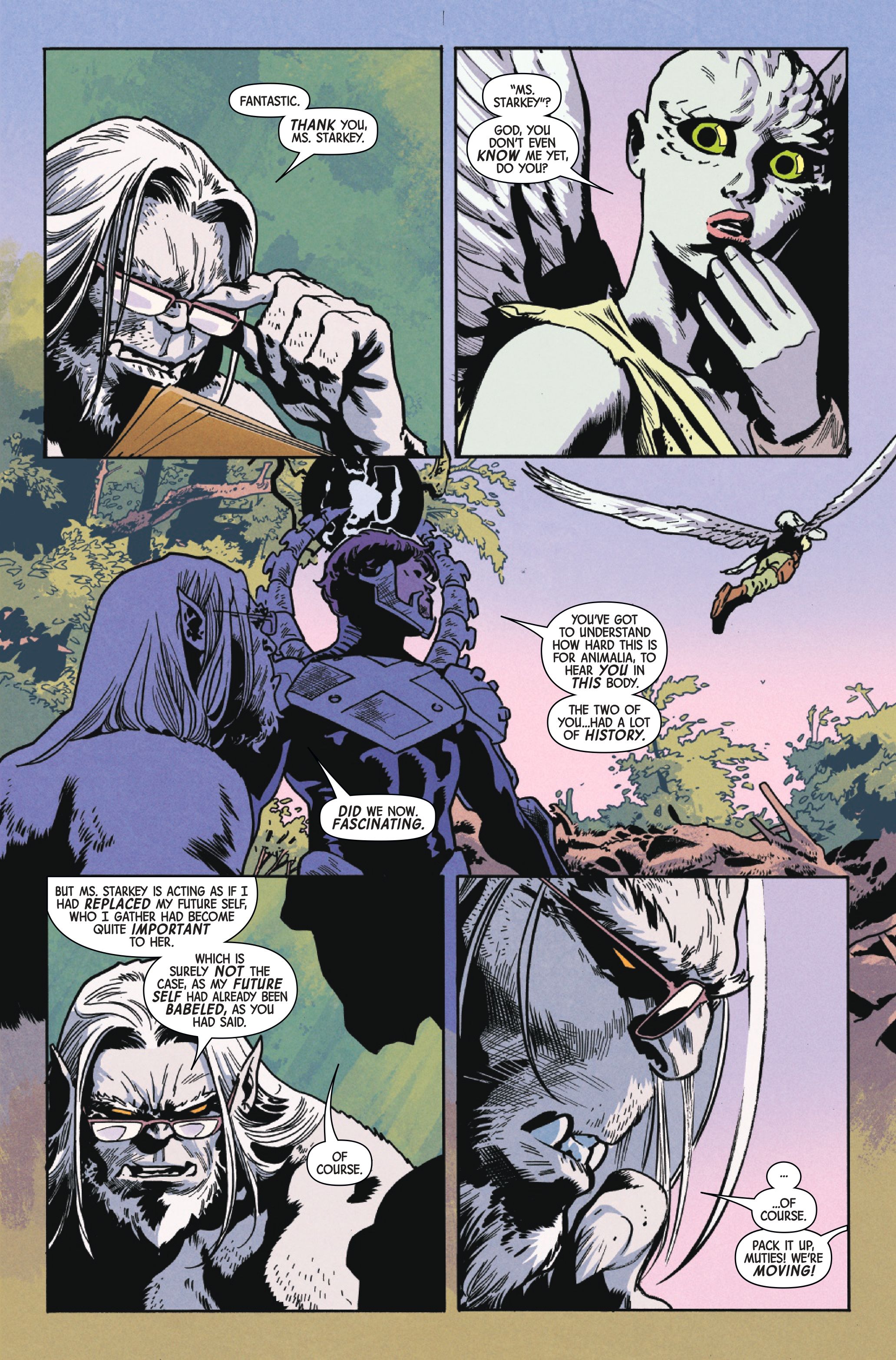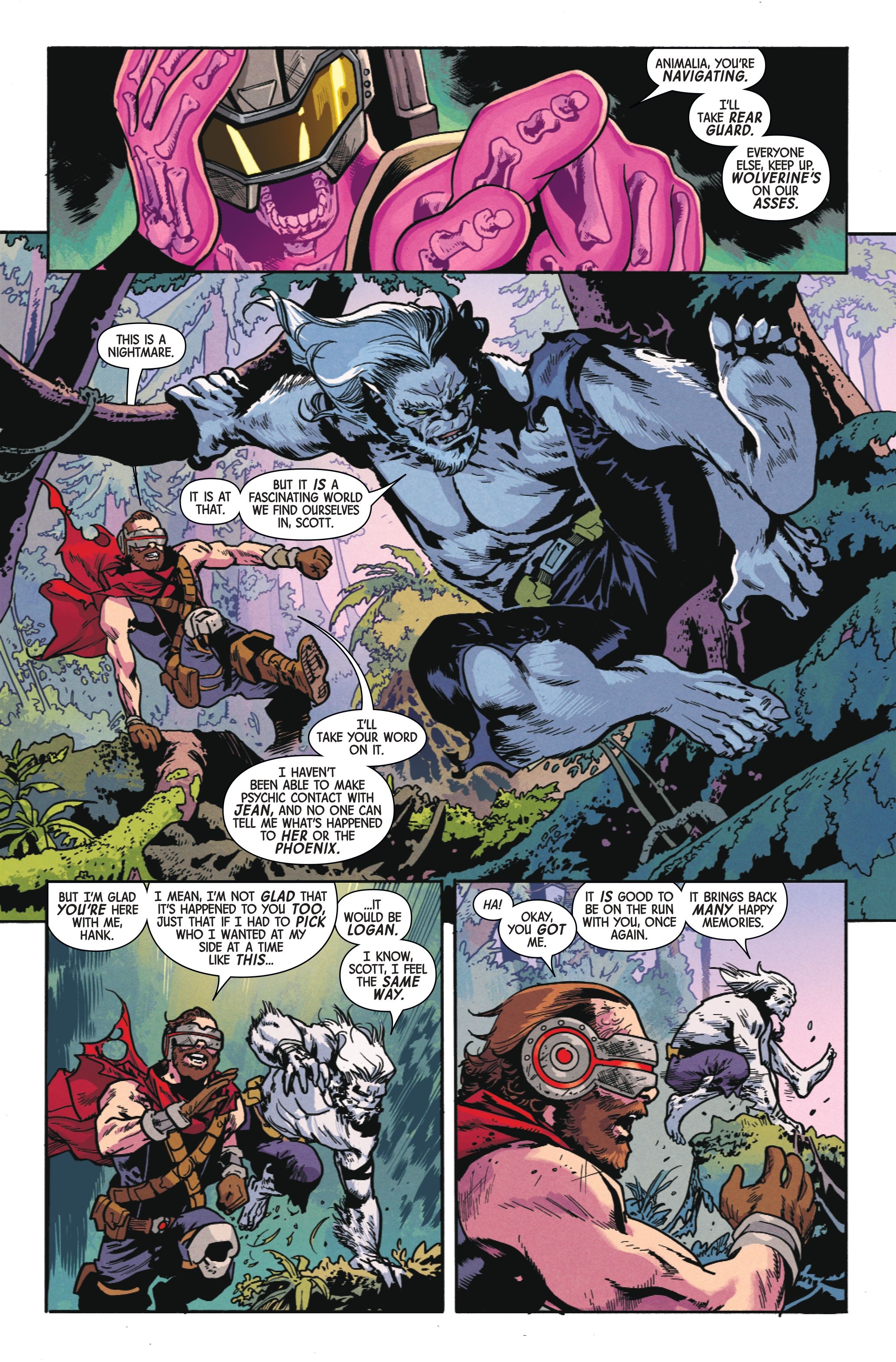 Это создаёт действительно странную ситуацию, когда Зверь встречает Джен, члена Людей Икс. Знаете, *я* следил за их отношениями годами – целое десятилетие, на самом деле! – и очевидно, что у них есть история. Но для *этого* Зверя, кажется, будто он встречает её впервые! Они флиртовали, безусловно, но это ещё не зашло далеко. Поэтому он ведёт себя с ней очень официально и вежливо, но это исходит от человека, с которым она так долго была вместе, и, честно говоря, это действительно ранит её чувства. Это просто…неловко, и так грустно наблюдать!