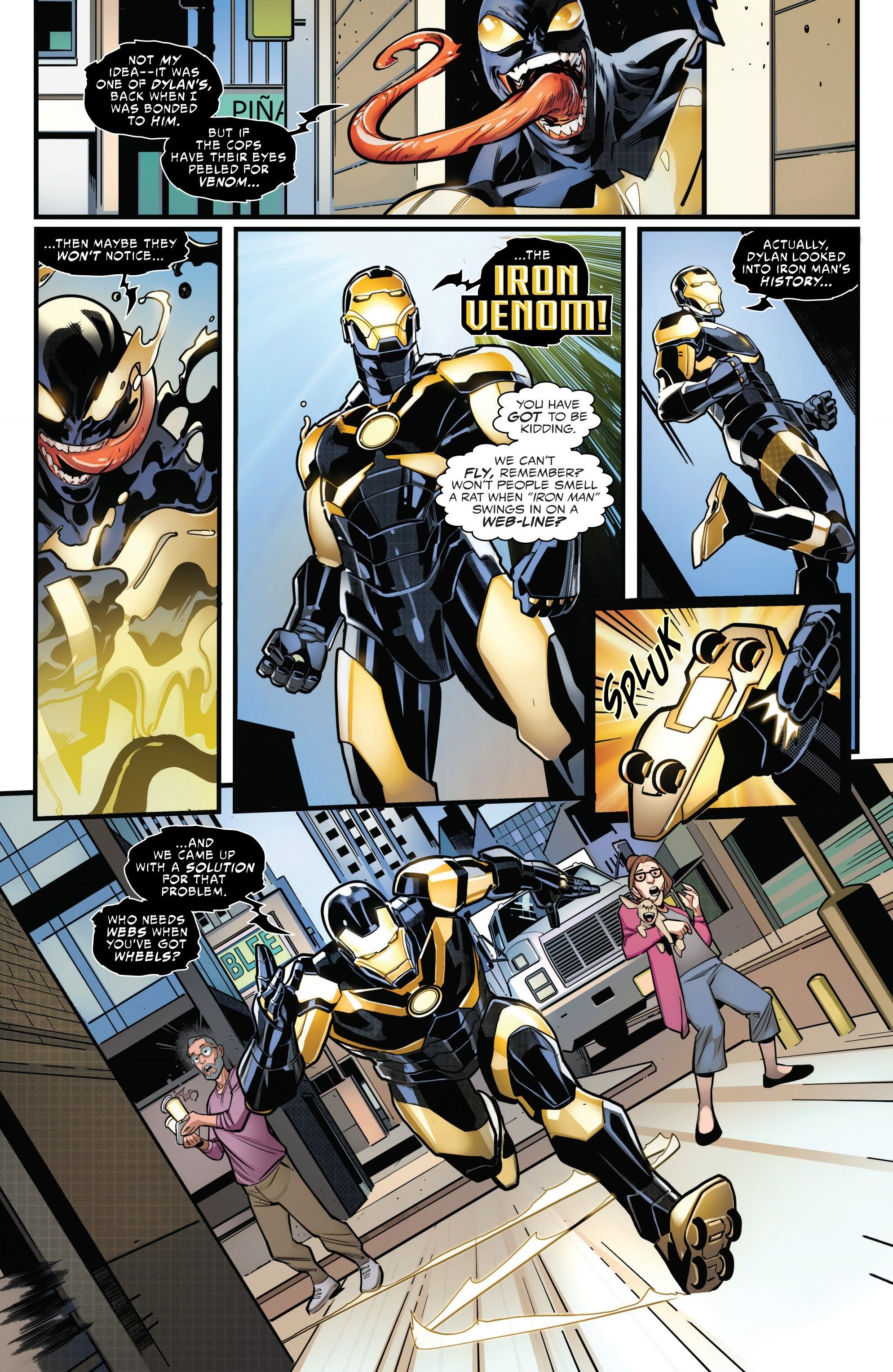 Веном забавно пародирует Железного человека, но поскольку Веном не умеет летать, он использует роликовые коньки вместо привычных летающих сапог Железного человека. Эта история демонстрирует внимательное отношение к деталям, ссылаясь на некоторые из более странных и старых дизайнов костюмов Железного человека.