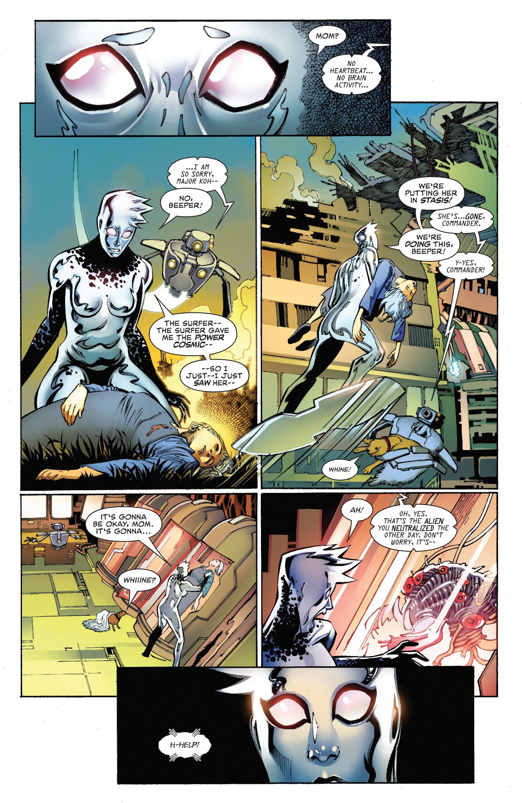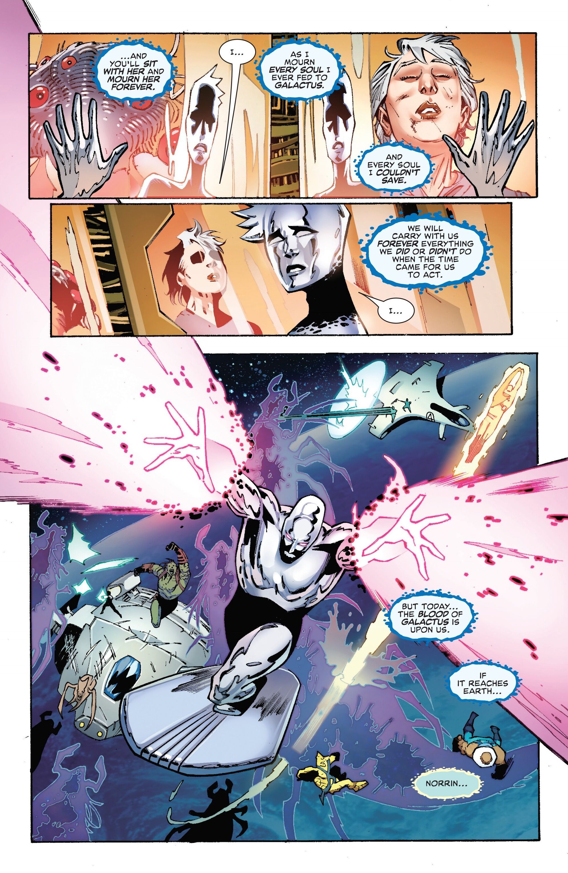 Действительно важно, что он выделил эмоциональную и личную сторону истории, потому что именно это делает выпуск #5 Death of the Silver Surfer таким впечатляющим – он фундаментально меняет то, кем является Серебряный Серфер как персонаж.