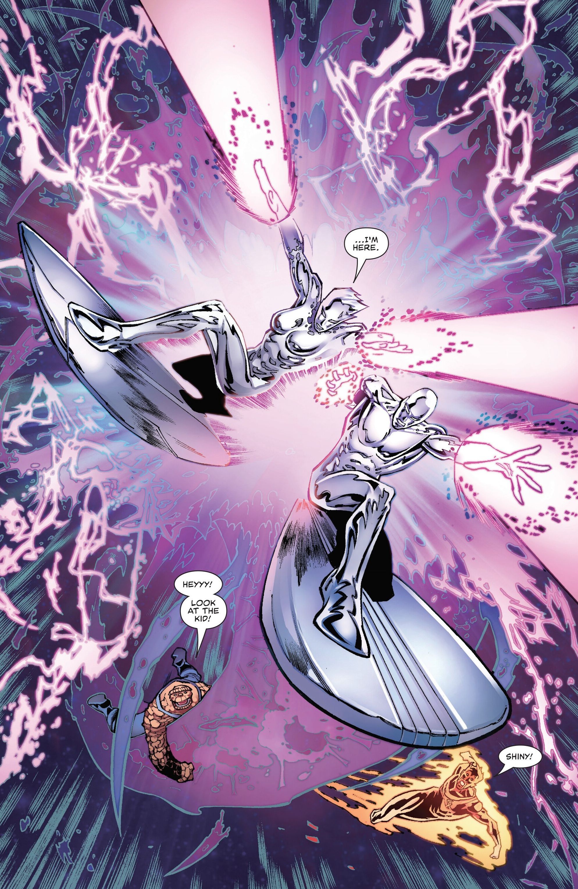 Окей, так что Фантастическая Четвёрка по сути попросила меня использовать силы Серебряного Серфера так, как это сделал бы он, и это заставило меня задуматься о кое-чём действительно крутом. Серфер всегда смотрел на человечество как посторонний, верно? Но я человек, и теперь я обладаю этой безумной космической силой. Это всё меняет! Это открывает совершенно новую историю, и честно говоря, это действительно захватывающая идея. Серфер достаточно доверял мне, чтобы поделиться своей силой, но я всё время думаю, правильно ли он поступил. Могу ли я вообще ей доверять? Я своего рода дикий кард, так что кто знает, куда я пойду с этими способностями. Мы всегда знали, где мы стоим с Серфером – он был хорошим парнем, даже во время того странного периода ‘Savage’. Но я? Всё по-другому. Я многому научился о том, что правильно, а что нет, в течение всего этого, но быть человеком с Космической Силой… это должно свести с ума, верно? То есть, что делает такая сила с человеком?