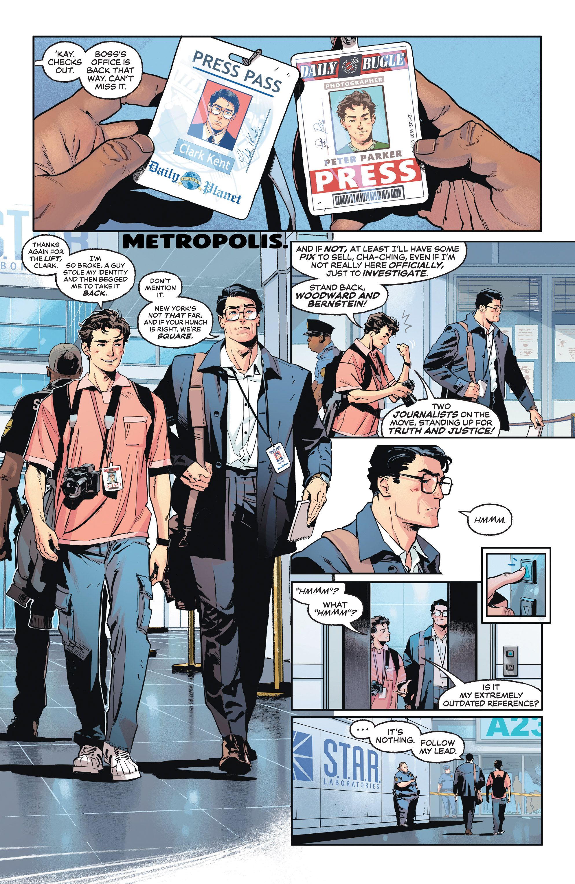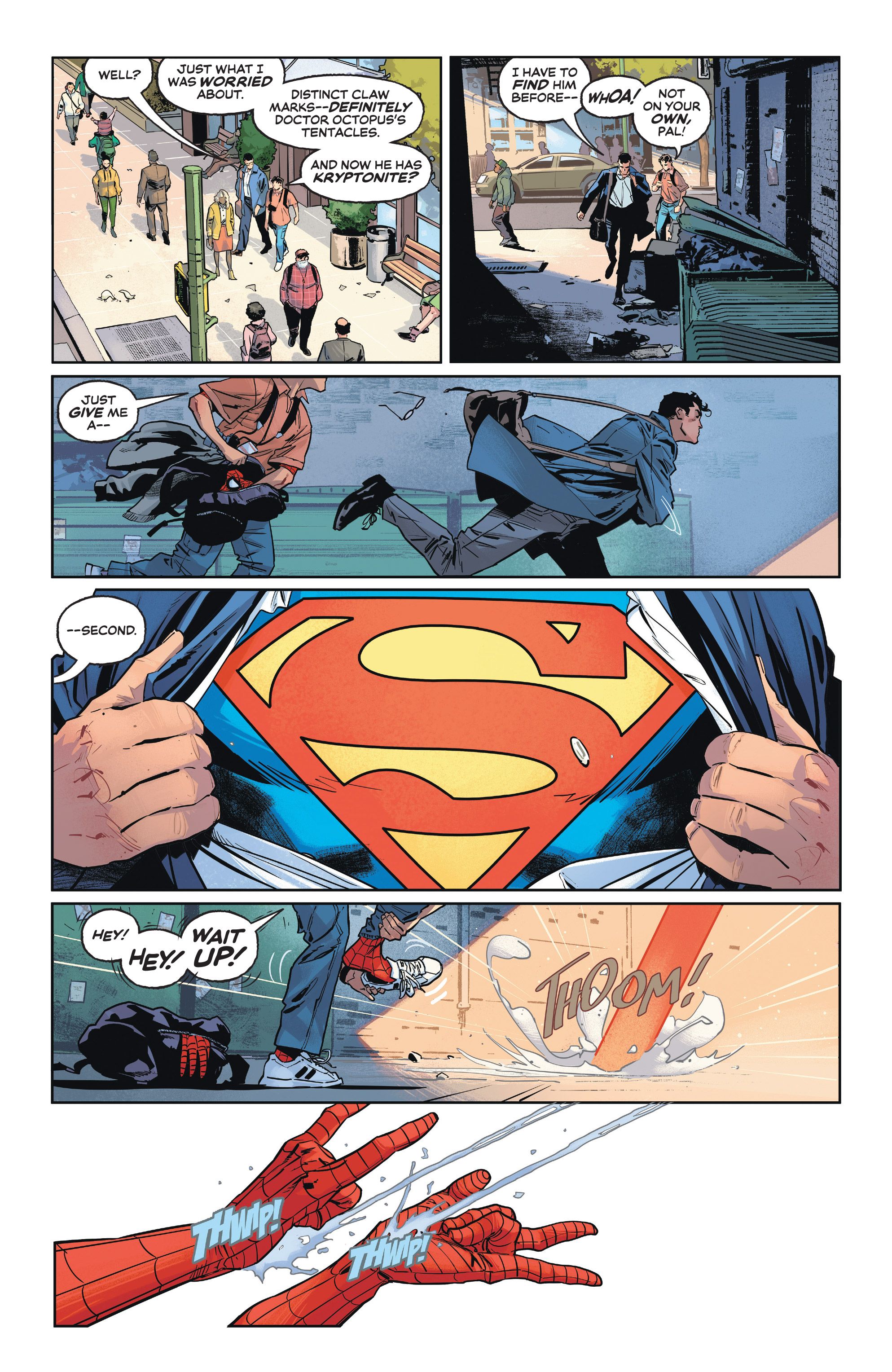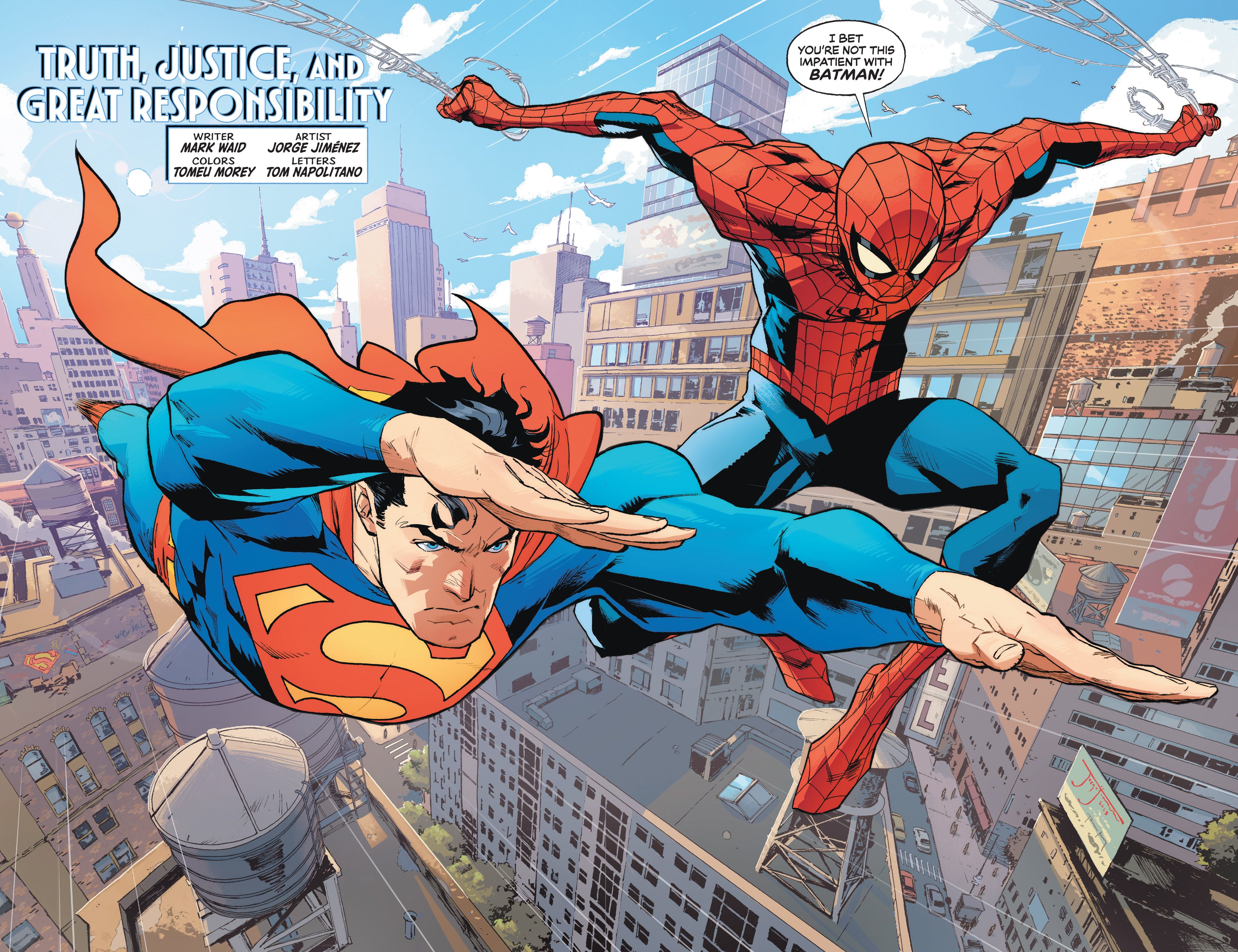 Основная история в Superman/Spider-Man, озаглавленная ‘Truth, Justice, and Great Responsibility’, создана писателем Марком Уэйдом, художником Хорхе Хименесом, колористом Томеу Морей и леттеристом Томом Наполитано. Это масштабное приключение, где Доктор Осьминог и Брэйниак объединяют свои силы, а использование Криптонита драматически меняет баланс сил.