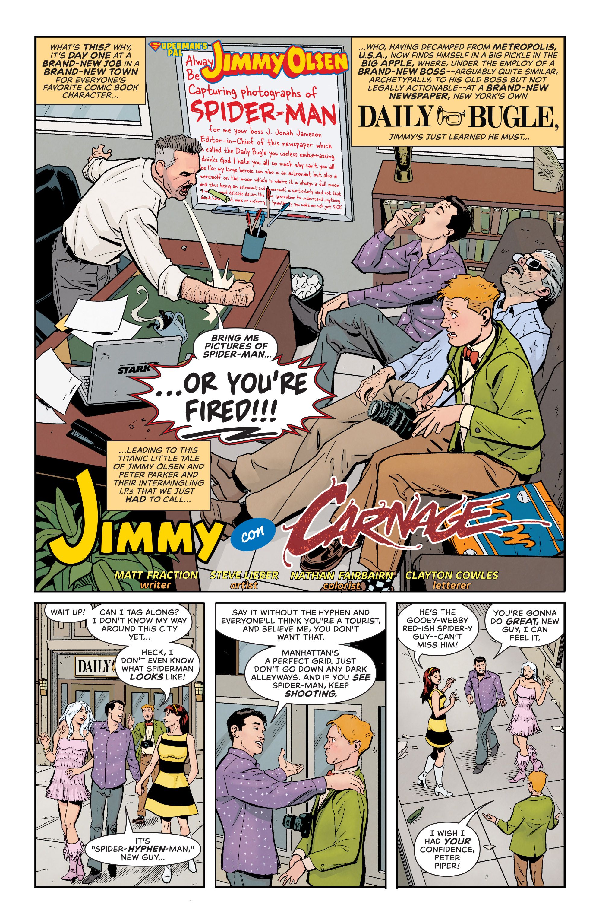 Команда, создавшая нашумевший комикс Superman’s Pal, Jimmy Olsen шесть лет назад — писатель Мэтт Фракшен, художник Стив Либер, колорист Нейтан Фэрберн и леттерист Клейтон Коулз — снова вместе для новой истории. На этот раз это отправляет Джимми Олсена в Нью-Йорк, где он неоднократно неправильно произносит имя Человека-паука, опуская дефис, как это обычно делает турист.