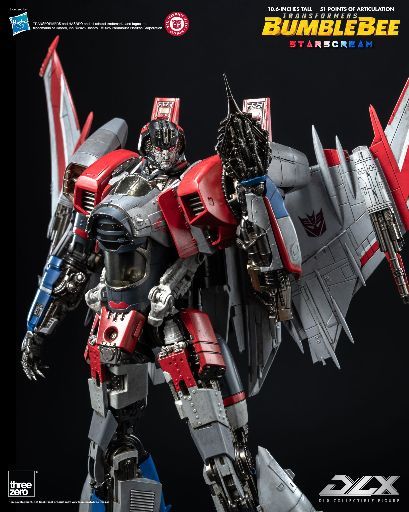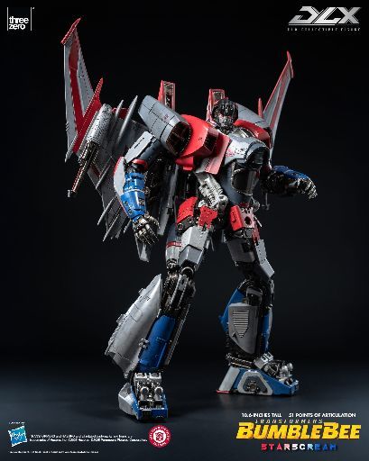 Первая новая фигурка Transformers от стороннего производителя threezero – Transformers: Bumblebee DLX Starscream, которая является перекраской фигурки Blitzwing, ранее выпущенной в той же серии. Как можно ожидать, дизайн основан на внешности Starscream в фильме Bumblebee, где у него и других персонажей дизайн был ближе к оригинальной эстетике G1. Эта фигурка Starscream отличается классическими красными, синими и серыми цветами, а также культовым кокпитом на груди. По сравнению с трансформирующимися версиями от Hasbro и Takara, эта фигурка имеет невероятное количество деталей из литого под давлением металла, создавая впечатление, будто модель персонажа из фильма ожила. Она также включает в себя систему освещения глаз с магнитным управлением, высокий уровень подвижности, бластер с нулевым лучом и оружие в виде шипованной руки.
